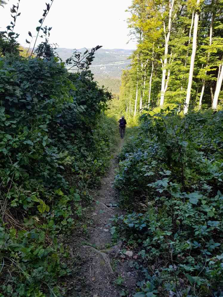 Nach dem Besuch der Warte und des Anninger-Schutzhauses nehmen wir uns den Abstieg in den Eschenbrunngraben vor. Der Weg – oder eher Pfad – beginnt unmittelbar hinter dem Hauptorientierungsbaum bei der Zufahrt zum Schutzhaus. Nach der Totalabholzung der Schneise ist er mittlerweile schon ein wenig zugewachsen und anfangs völlig markierungslos. Nach ca. 150 m erspäht man mit viel Mühe noch den im Buch beschriebenen Hinweis auf die blassen Buchstaben H.BR. (offensichtlich Hinterbrühl), wo man sich rechts in die Senke begibt – immer in Blickkontakt mit der Außenringautobahn. Im Bild links die blassgelben Buchstaben, rechts der Abstieg …