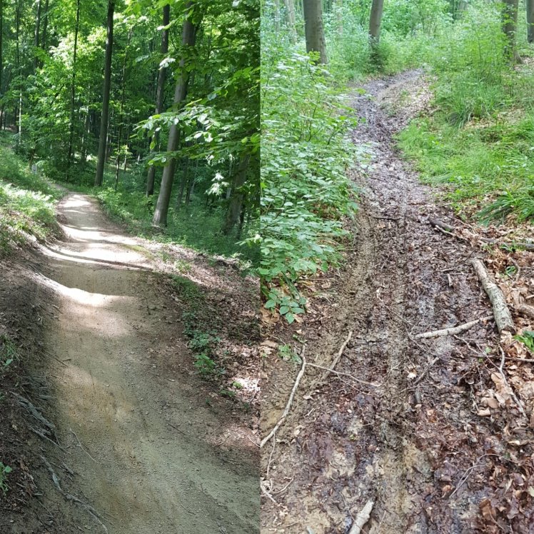 Nur: Das ist einigen der Bergradler völlig wurscht, und deshalb sieht der Wanderweg bei feuchtem Boden auch so aus wie auf dem Bild oben rechts. Aus diesem Grund haben wir in unserem Buch „Wandern im Wienerwald“ auch nicht unerwähnt gelassen, dass der Mountainbiker der natürliche Feind des Wanderers ist. Nicht umsonst stimmen viele Zuhörer bei unseren Vorträgen diesem Satz vorbehaltlos zu … (ph)