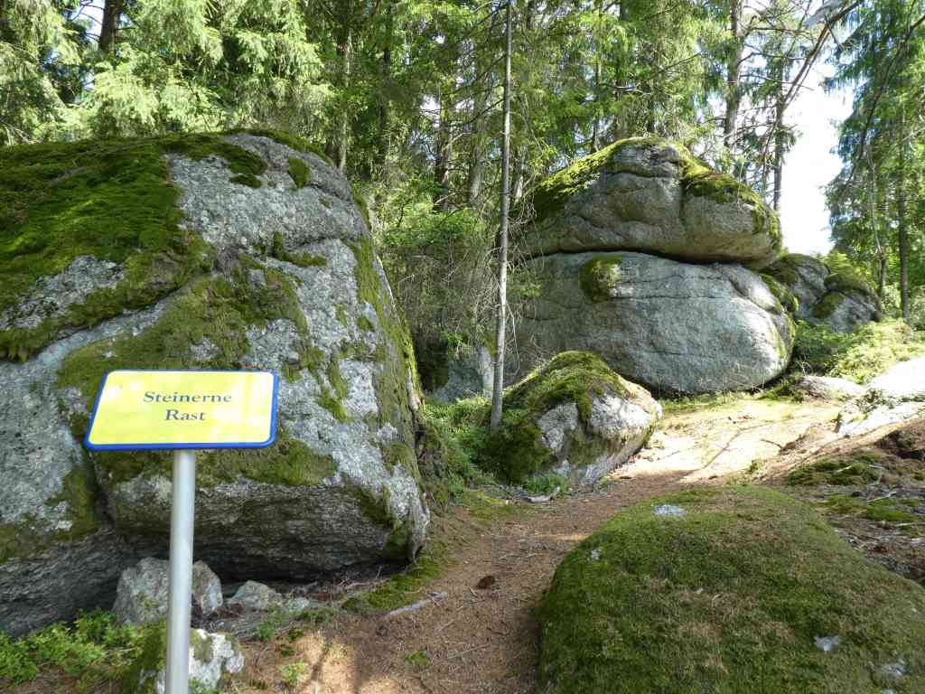 Wir verlassen das Gelände nach Durchquerung durch das Hauptportal und folgen dem gelben Pfeil des Stein-Gigantenwegs über eine Waldrast zur Hauptstraße hinunter. Hier setzen wir über den Jägerweg fort – geradewegs in den nächsten Wald, wo wir zwischen hohen Stämmen die Steinerne Rast erreichen.