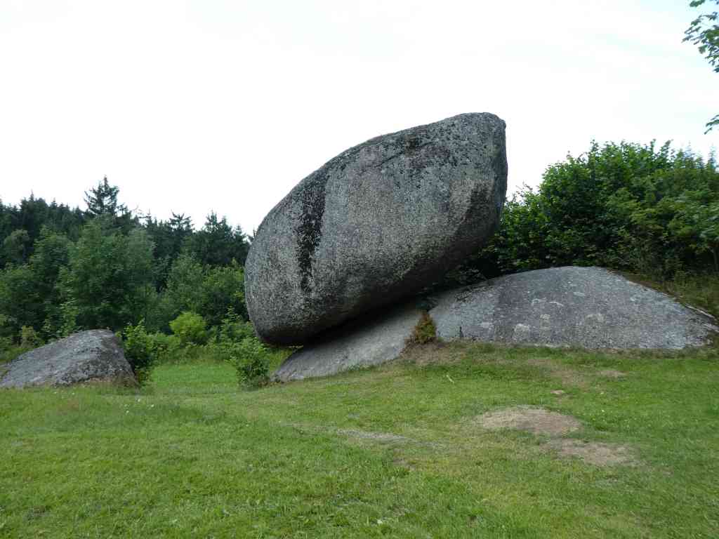 Weitere Restlinge erwecken unsere Aufmerksamkeit, bevor wir hinter einer Häusergruppe wiederum auf den Ort zusteuern. Noch vor dem Erreichen der Straße sollte wir aber dem Franzosenstein einen Besuch abstatten. Dieser Felsbrocken ist einer der bekanntesten der Gegend und droht optisch jeden Moment von seiner schrägen Auflagefläche abzugleiten. Welche Geschichte damit verbunden ist, wird in unserem Buch enthüllt.