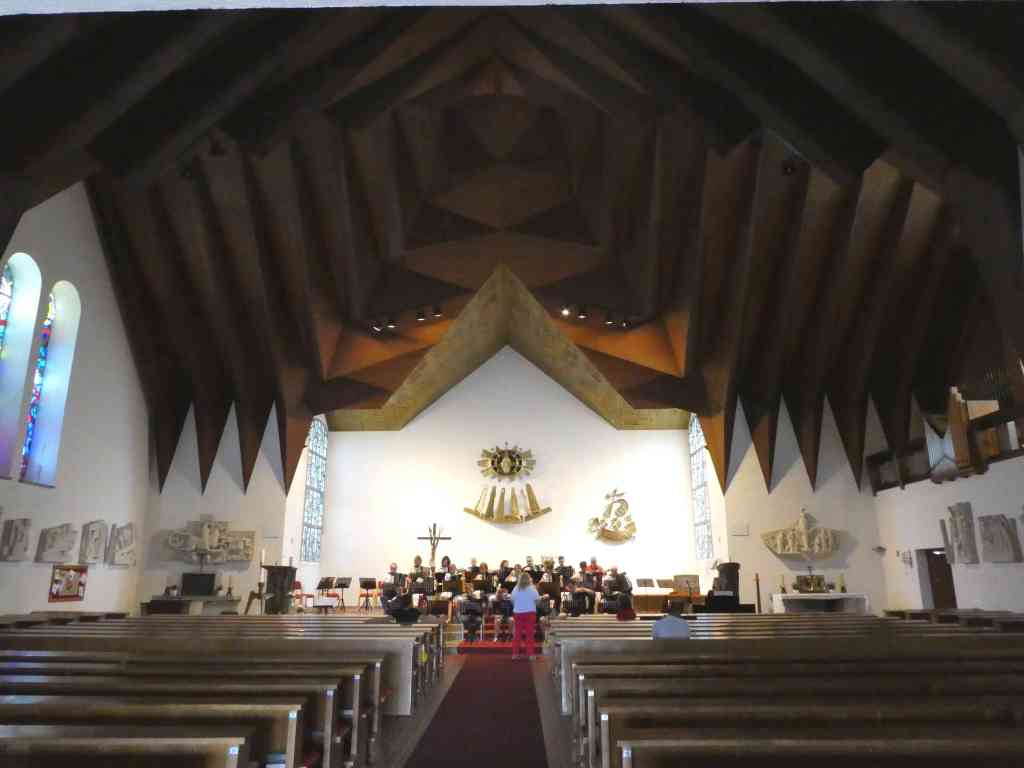 Wir gelangen auf ihr zu einem Vorplatz eines Ausstellungszentrums, das Leben und Werk des ortsansässigen Künstlerpfarrers Josef Elter (1926–1997) in den Fokus rückt und das wir Freitag bis Sonntag besuchen können. Auch die Pfarrkirche wurde von ihm gestaltet. Spektakulär ist vor allem die ungewöhnliche Holzfaltdecke.