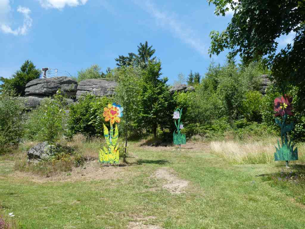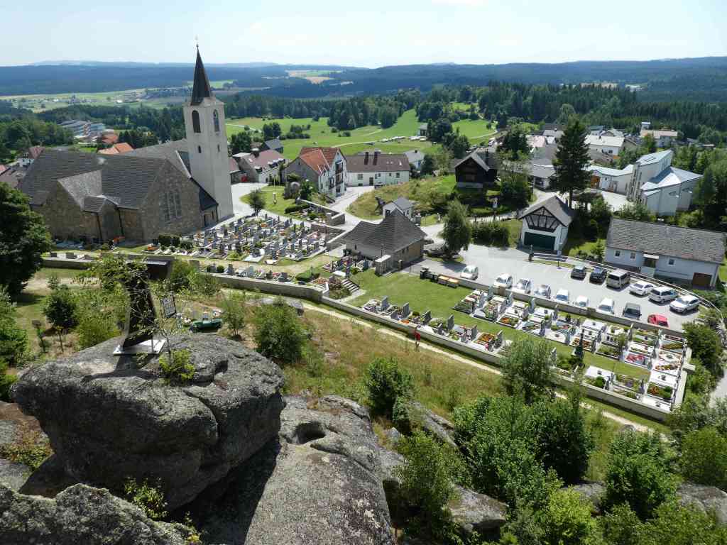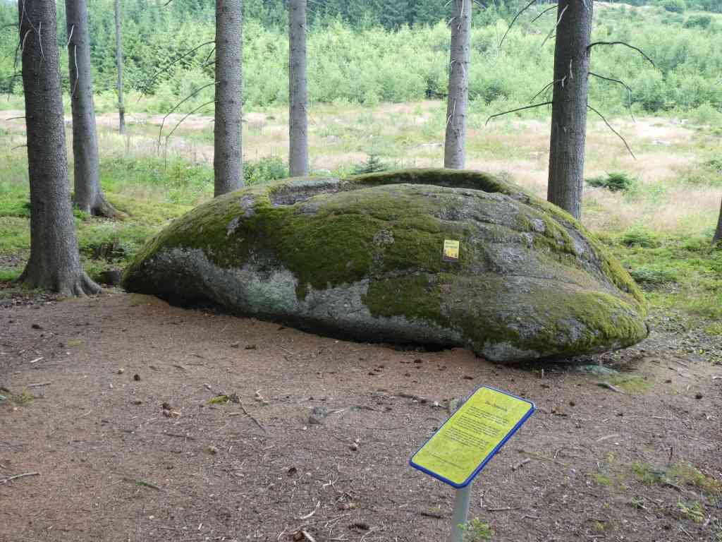 Dazu verlassen wir das Kirchenplateau durch die Schulgasse und am Kindergarten vorbei auf dem Planeten-Wanderweg, der gleichzeitig der Stein-Gigantenweg ist, und gelangen schon nach wenigen Minuten zum Opferstein …
