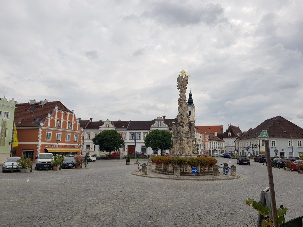 Auf dem Kornplatz – dem alten Getreidemarkt – steht die imposante Pest- oder Dreifaltigkeitssäule, die 1791 zum Dank dafür errichtet wurde, dass die Bürger von Langenlois von der Pest verschont blieben.