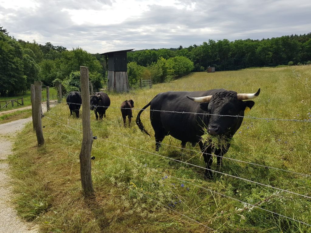 Wenn wir uns dann wieder auf einer freien Fläche befinden, biegen wir bei einer Kuhweide (als wir unterwegs waren, konnten wir die Tiere – siehe unten – bewundern) scharf rechts ab und marschieren dann auf dem Gaisberg-Rundwanderweg zu den letzten Ausläufern der Ortschaft Straß im Straßertale hinab, wo wir schon unser nächstes Zwischenziel vor uns aufragen sehen.