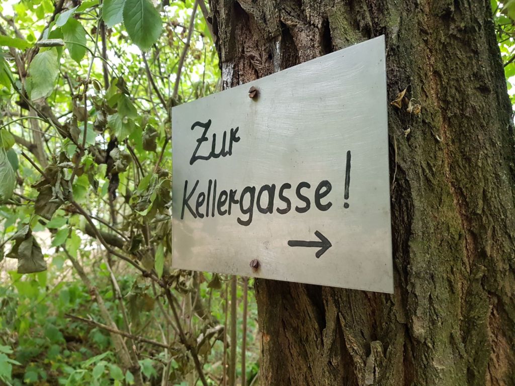 Wenn man sich Zöbing am Heiligenstein – dem Start der Tour 6-1 („Steile Steige“) in unserem gerade rechtzeitig zur Wandersaison erschienenen Buch „Wandern im Waldviertel“ – nähert, sieht man von unten schon die Kamptalwarte aufragen. Sie ist das erste Teilziel dieser Rundwanderung und führt uns geografisch schon fast ins Weinviertel hinunter. Aber zuerst einmal erreichen wir den Beginn dieser Wanderung, den Gasthof Gutmann „Zur schönen Aussicht“, an dessen Rückseite uns ein schmaler Steig zur Heurigengasse Am Heiligenstein hinaufführt. Dort wenden wir uns rechts und gehen auf einem Weinlehrpfad mit schöner Aussicht weiter, bis links ein unscheinbarer Pfad in den Wald abzweigt. Dieser Weg ist nicht markiert; erst nach dem ersten Abschnitt, wo wir einen Traktorweg kreuzen, sehen wir das von Hand gebastelte Schild auf dem folgenden Bild. Danach geht die Kletterei allerdings noch steiler weiter …