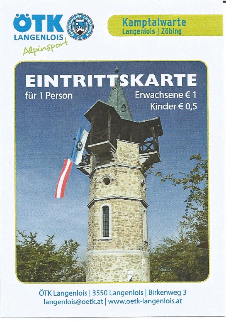 Wer nicht in Stimmung für diesen ersten steilen Steig ist oder nach feuchtem Wetter zu Recht rutschige Bodenverhältnisse fürchtet, für den geben wir im erwähnten Wanderbuch eine Alternativroute an, auf der man auch nicht viel länger unterwegs ist. Beide Wege führen jedenfalls zur Kamptalwarte, für die man sich im Ursin-Haus im Langenlois (einem der sieben Ausgangspunkte in „Wandern im Waldviertel“; siehe auch unseren kurzen Rundgang durch die Stadt) hoffentlich rechtzeitig einen Schlüssel geholt hat – und diese nette Eintrittskarte: