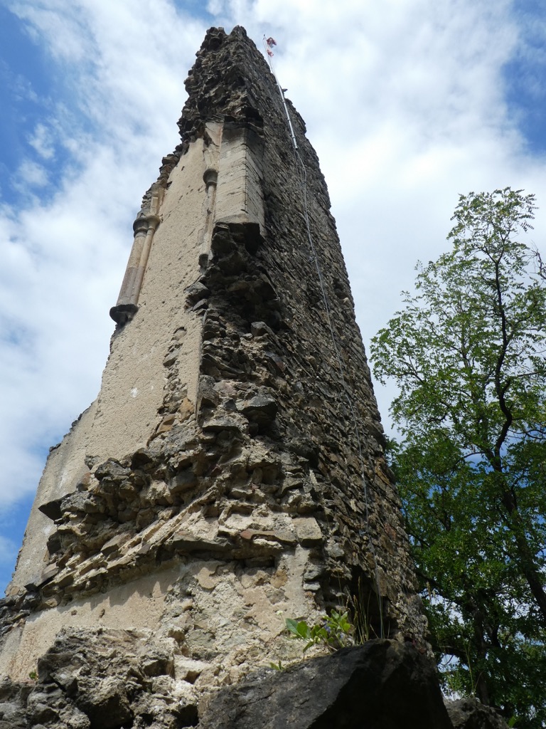 Nun geht es wieder bergauf, diesmal auf den Schloßberg, wo wir – nach einem kurzen Steilstück – die Ruine Falkenberg erreichen, von der nicht mehr viel übrig ist, wie man auf dem Bild sieht: der Bergfried und daneben ein Mauerrest mit Torbogen. Von den Resten dieser ehemaligen Höhenburg wandern wir weiter zu einem Rastplatz mitten im Wald, wo uns Informationstafeln Interessantes über die Geschichte der im 12. Jahrhundert vom Geschlecht der Falkenberger errichteten Burg verraten.