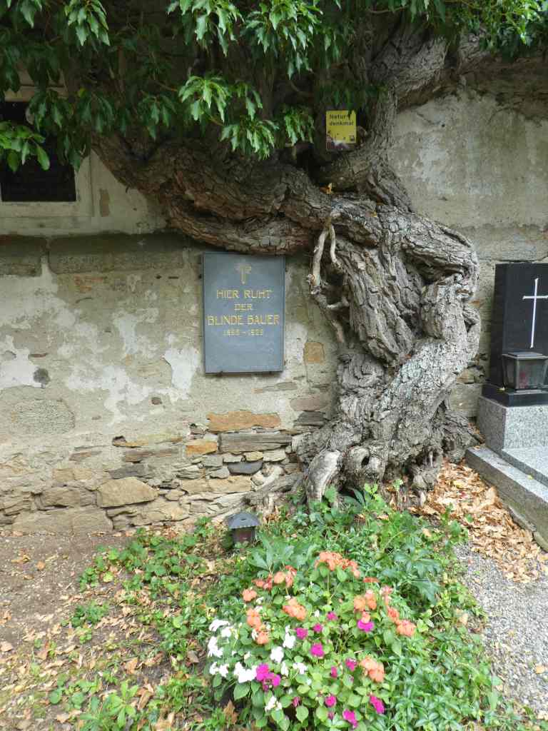 Beim Lagerhaus biegen wir links ab, gehen an einer großen Lagerhalle vorbei und durch einen Busparkplatz zur Mandlgupfstraße vor, die auf den Weitenbach zuläuft. Am Freibad und am Campinggelände entlang führt die Straße zu einer Gärtnerei. Bei den hinteren Privathäusern schlängelt sich am obersten Haus links ein Pfad zur Annakirche vorbei. Nach einem kurzen, markanten Aufstieg erreichen wir die Anhöhe der Kirche St. Anna im Felde und den sie umgebenden Friedhof durch das westliche Tor der Einfriedung und stehen unmittelbar vor dem Grabstein des blinden Bauern unter einem gewaltigen Efeubaum.