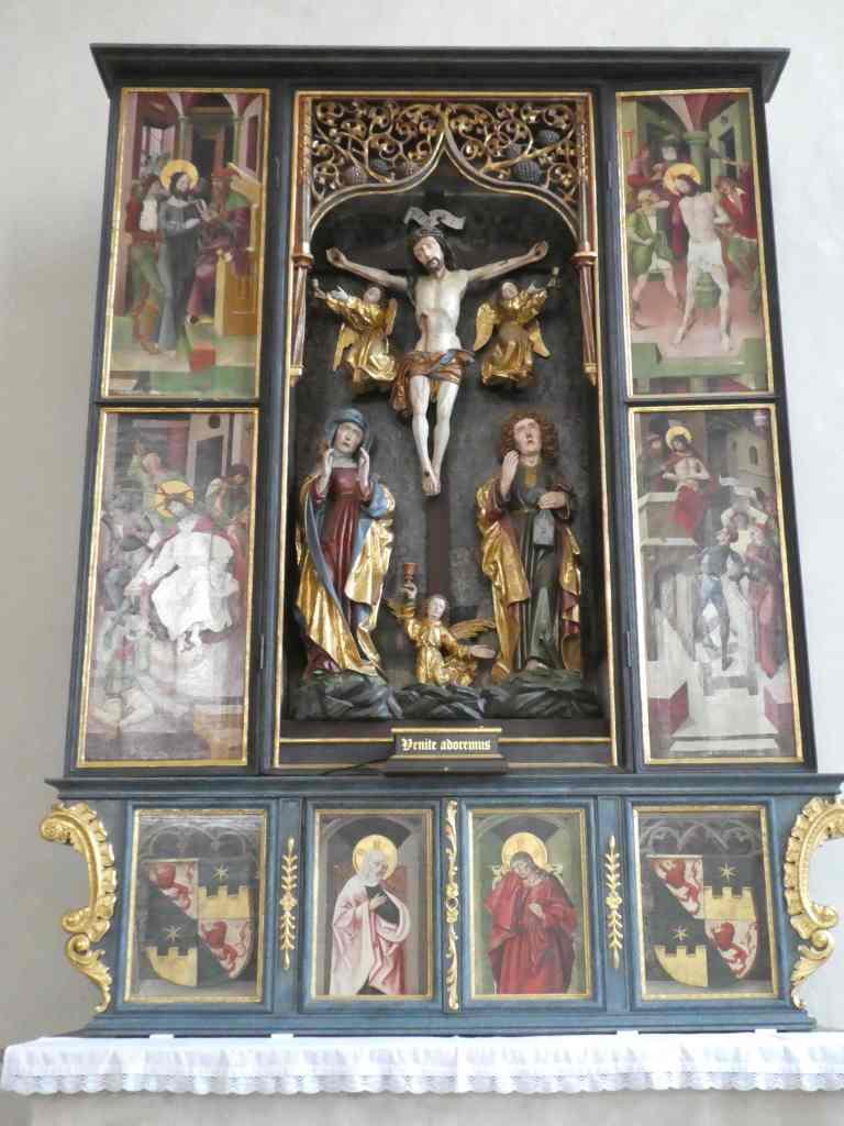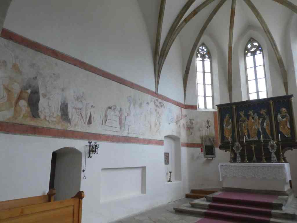 Wir gehen links herum und gelangen gleich ins Innere des Sakralbaus, der nur Samstag, Sonntag und Feiertag geöffnet ist. Der Chor birgt einen dreiteiligen neugotischen Hochaltar mit vergoldeten spätgotischen Relieffiguren von fünf heiligen Frauengestalten von ca. 1480. An der Nordwand erkennt man Freskenreste mit Szenen aus der Leidensgeschichte Jesu.