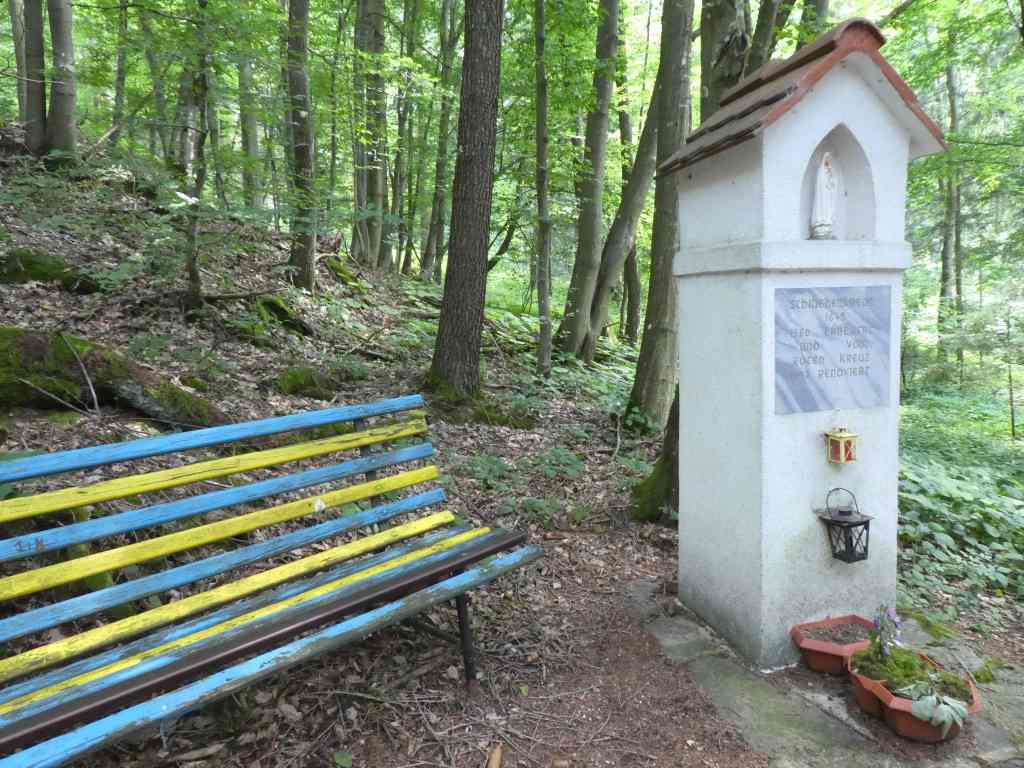 Über den Parkplatz gehen wir auf dem St.-Anna-Weg die Stationen des Millenniums-Kreuzwegs entlang in den Ort zurück. Dort wenden wir uns durch die Sparkassenstraße auf das Ortszentrum zu. In der Siegfried-Ludwig-Straße kommen wir rechts gewendet zu einer Stiege und einer Hauspassage und treten danach auf den Hauptplatz hinaus. Damit stehen wir wieder vor dem zentralen Gebäudekomplex der Gemeinde.