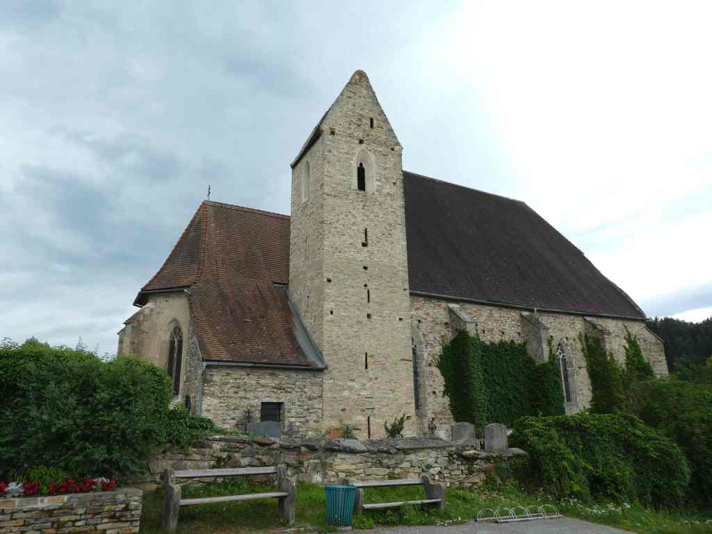 Am Friedhof stehend betrachten wir noch auf der äußeren Ostwand ein Fresko. Es stellt Christus am Ölberg dar und stammt etwa aus dem Jahr 1500. Bemerkenswert ist im Hintergrund die gotische Klosteranlage, die an Stift Melk erinnert, das zu dieser Zeit noch gar nicht erbaut war.