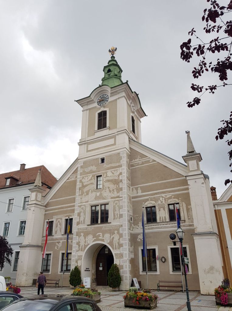 Die in unserem neuen Buch „Wandern im Waldviertel. Die 33 schönsten Wanderungen und 7 Stadtspaziergänge“ beschriebene Stadtrunde beginnt vor dem Alten Rathaus, einem imposanten Profanbau aus der Zeit der Kuenringer auf dem Sparkassenplatz. Heute ist in dem mit Renaissance-Sgraffiti verzierten Gebäude die „Zwettl-Info“ sowie das sehenswerte Zwettler Stadtmuseum untergebracht, dem man unbedingt einen Besuch abstatten sollte. Untertags bietet sich hier auch die Gelegenheit, fünf Minuten nach jeder vollen Stunde dem Glockenspiel im Rathausturm zu lauschen.