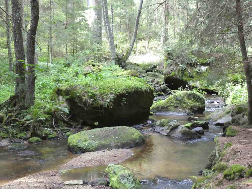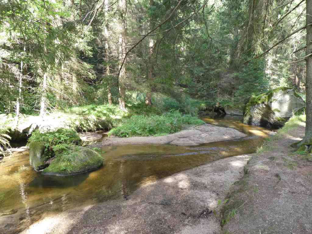 200 m nach rechts weitergegangen, gelangen wir zur Steingruppe mit dem ehemaligen Wackelstein, der 2011 infolge eines zu intensiven „Bewegungsversuchs“ abstürzte und auseinanderbrach. Glücklicherweise kam niemand zu Schaden. Die beruhigende Wirkung der Steine an dieser Stelle und im Flussbett sind ein bleibender Eindruck, den wir noch auf uns wirken lassen können, bevor wir den Rückweg zur Kapelle antreten.