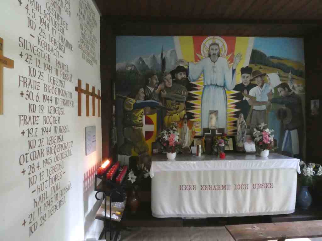 Unvermittelt – 5,8 km nach dem Opferstein – stehen wir vor einem weiteren Objekt der erwähnten Kraftarena: Es ist die Klauskapelle, ein schlichter Holzbau in Form einer Unterstandshütte mit einem Glockentürmchen, das eine besondere Funktion erfüllt.