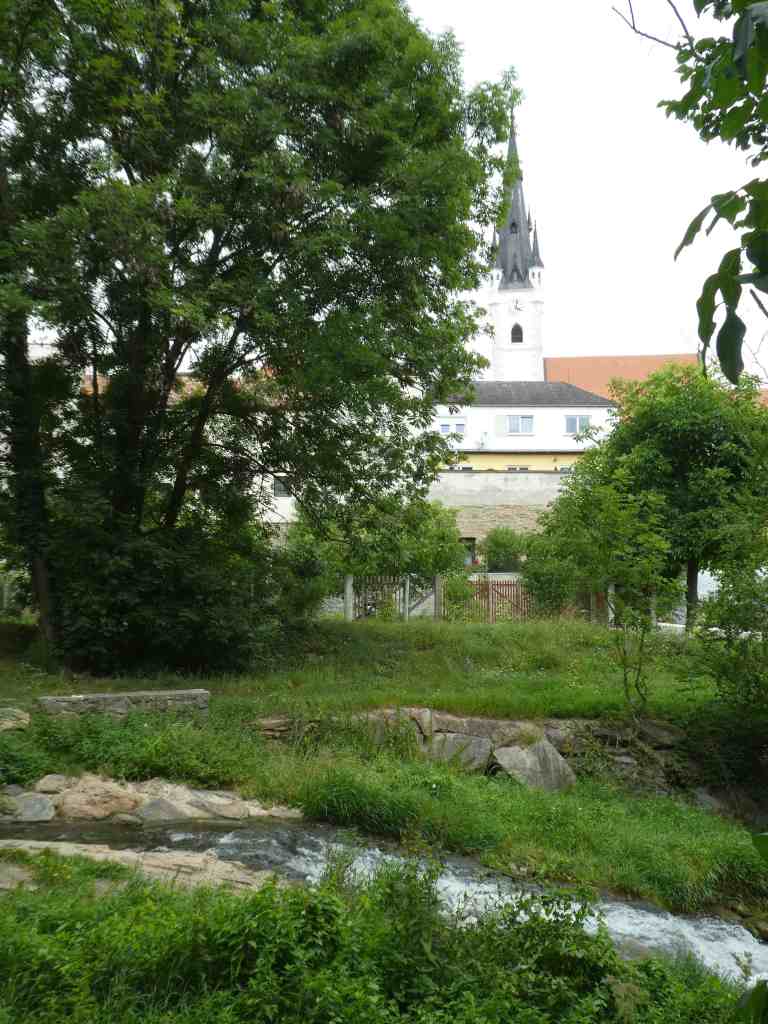 Über die Gasse Im Naturpark kommen wir in die Riedenburgstraße, die wir rechts vorgehen. Halb links vor uns erkennen wir die alte Pfarrkirche St. Stefan, die etwa 1250 entstand, später erweitert und barockisiert wurde. Noch vor der Prager Straße benützen wir eine Brücke über die Taffa, wo es nach rechts zum Geschützturm von 1594 geht, der nun zwischen modernen Bauten eingezwängt ist …