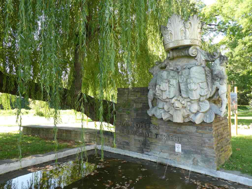 Am mächtigsten Turm der Stadtmauer vorbei schlüpfen wir durch die Einkaufspassage Öhlknechthof, kommen in die Prager Straße und halten uns links. Auf Nr. 9 befand sich bis 1895 das Prager Tor. Das Allianzwappen Hoyos-Sprinzenstein ist noch erhalten und gegenüber im Stadtpark aufgestellt, in den wir nach der Bezirkshauptmannschaft über den lärmigen Schützenplatz hinübergehen. Das erwähnte Wappen ist Gestaltungselement eines Kriegerdenkmals mit Brunnen und Tümpel unter einer extrem schiefstämmigen Weide.