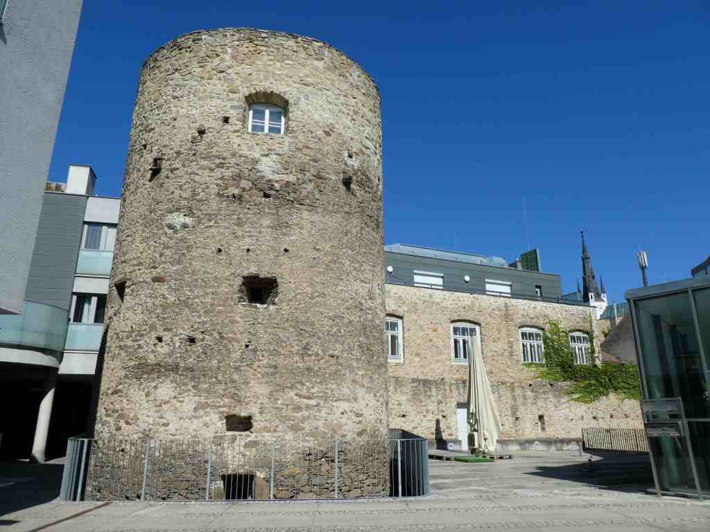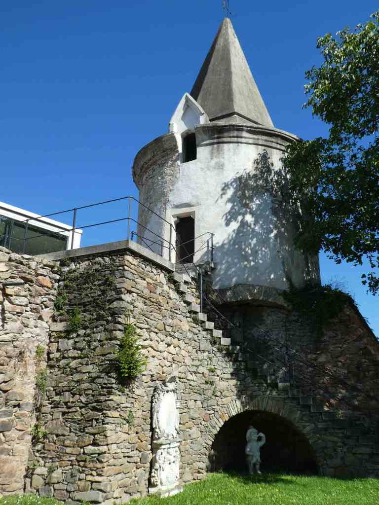 Auf dem Kirchenplatz beachten wir noch das Sgraffitohaus von 1587 (letztes Bild ganz unten), das 1767 bis 1850 als Rathaus diente und seither Bezirksgericht ist, spazieren durch die Pfarrgasse zur Thurnhofgasse, wo wir in einem schmalen Durchgang fortsetzen, um zu den nördlichen Stadtmauerteilen zu gelangen. So erreichen wir das Rondell, das als Bauelement der Zwingermauer eingegliedert war.