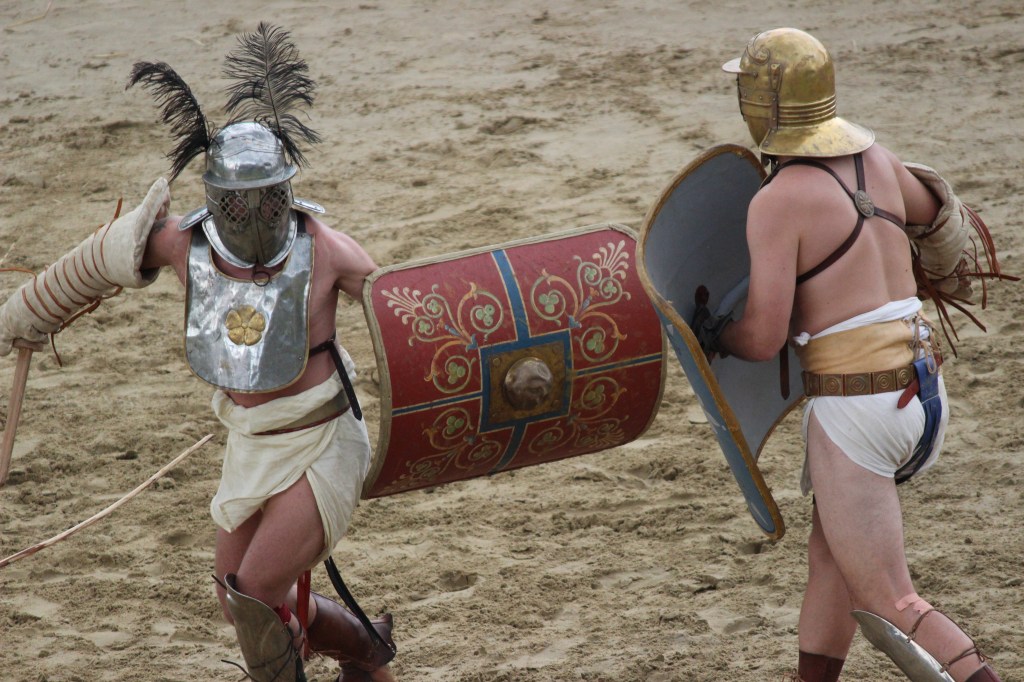 Hier versucht man den Besuchern zu vermitteln, dass Gladiatorenkämpfe kein primitives „Abmetzeln“ zum Gaudium der Bevölkerung waren, sondern sportliche Wettkämpfe, die einem strikten Regelwerk folgten, wenngleich sie auch tödlich enden konnten. Die Schaukämpfe an diesem Tag sind echt und nicht abgesprochen. Gekämpft wird allerdings mit Holzwaffen, wie dies auch in der Antike zu Trainingszwecken und bei den Morgenkämpfen der Fall war.