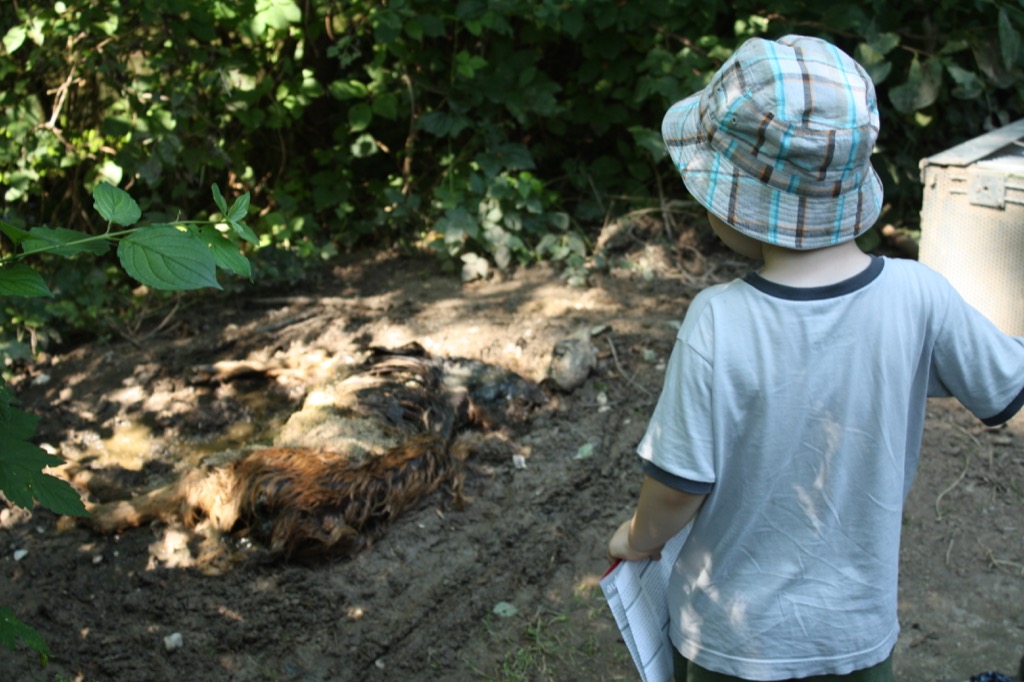 Auch dieses Thema wird thematisiert. Mein Sohn war fasziniert vom „Kadaver der Woche“ und seinen Bewohnern. Das muss nicht bei jedem Kind so sein; man sollte die kleinen Entdecker daher eventuell darauf vorbereiten, oder – wenn man weiß, dass das eigene Kind sensibel reagiert – diese Station lieber auslassen und anhand des großartigen Bilderbuchs Wo bleibt die Maus?, das auch beim Nationalpark aufliegt, den Lauf der Natur erklären.