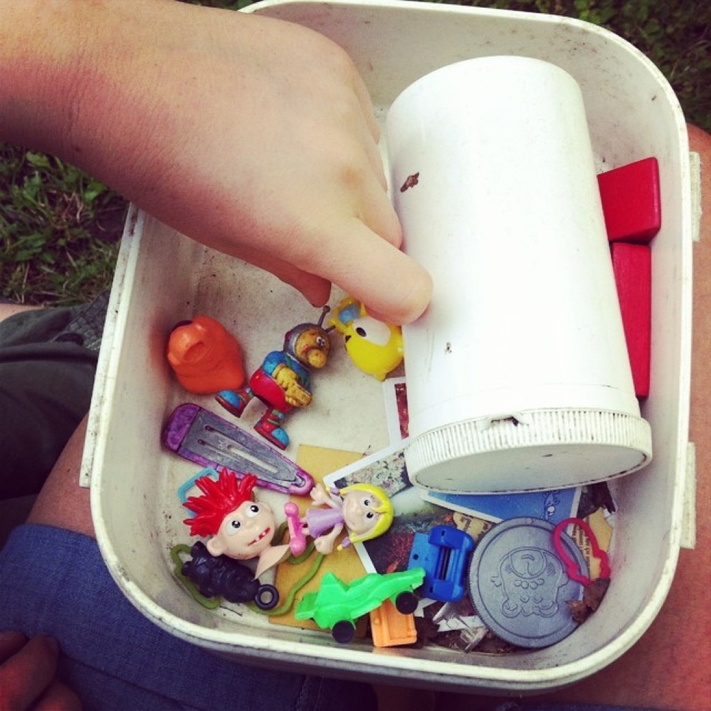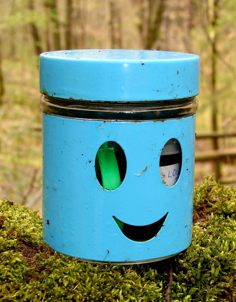 Wir haben unseren ersten Geocache durch Zufall entdeckt: ein Rex-Glas in einem Baumstumpf, befüllt mit einem winzigkleinen Heft, in das sich Leute eingetragen (Logbuch) haben, und „Schätzen“, die bei meinem damals erst fünf Jahre alten Sohn große Begeisterung hervorriefen. Das Moos war verrutscht und hat das Versteck preisgegegeben. Zu Hause haben wir uns dann im Internet schlau gemacht und gingen am nächsten Tag gut ausgerüstet gleich wieder auf die Suche. Seither konnten wir schon die unterschiedlichsten Caches heben: Dinosaurier aus Baumwipfeln, PET-Flaschen unter Brücken, Schatztruhen in Höhlen und eine unechte Schraubenmutter an einer Nostalgie-Dampflock (Micro-Cache) – es war jedes Mal eine Überaschung! Hier seht ihr ein paar Beispiele: So sieht ein Geocache aus.