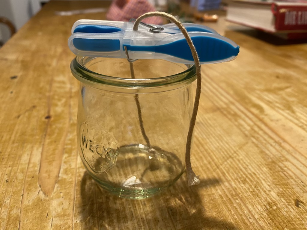 - Kerzendocht an einer Wäscheklammer festmachen und diese auf zwei Schaschlikspieße legen, sodass der Docht mittig in der Kerze hängt
