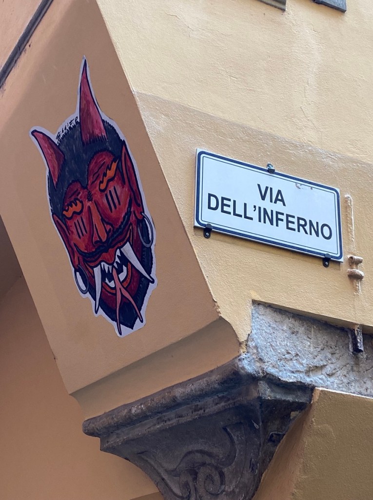 PS: Wir haben übrigens herausgefunden, warum vor der Basilica San Petronio Bewaffnete stehen und aufpassen, wer diese schöne Kirche betreten will: wegen des Wandgemäldes, das auf dem Bild unten zu sehen ist. Es ist an der Wand eines Extra-Altars befestigt, für den man auch extra Eintritt zahlen muss (das Photo ist von draußen aufgenommen und daher ein bissl schief; drinnen herrscht Photographierverbot) und zeigt Himmel und Hölle nach Dantes „Inferno« – mit Schwergewicht Hölle, weil die immer schon interessanter war. Dort sieht man einen haarigen, monströsen Teufel, der oben Menschen frisst und sie unten wieder ausscheidet, umgeben von Sündern, die in den diversen Höllenkreisen für ihre Vergehen auf Erden leiden müssen. Der nackte Kerl, der rechts oberhalb des Satanskopfs an den Felsen gebunden ist, hat sich der Ketzerei schuldig gemacht – und sein Name steht deutlich daneben: Mohammed.