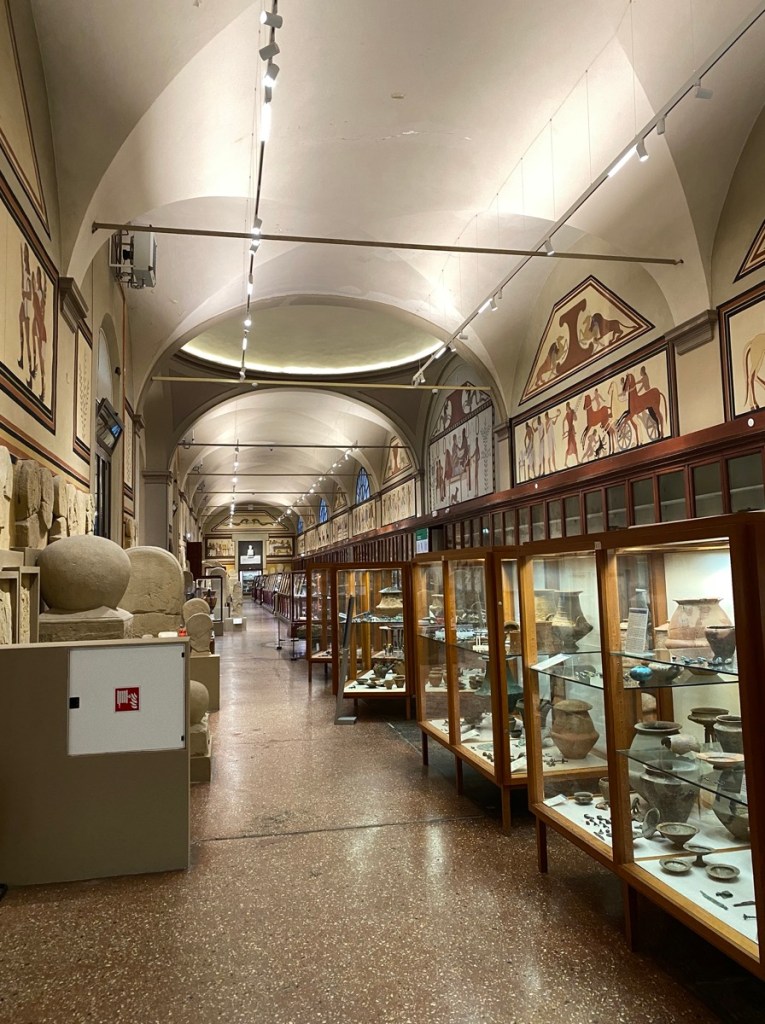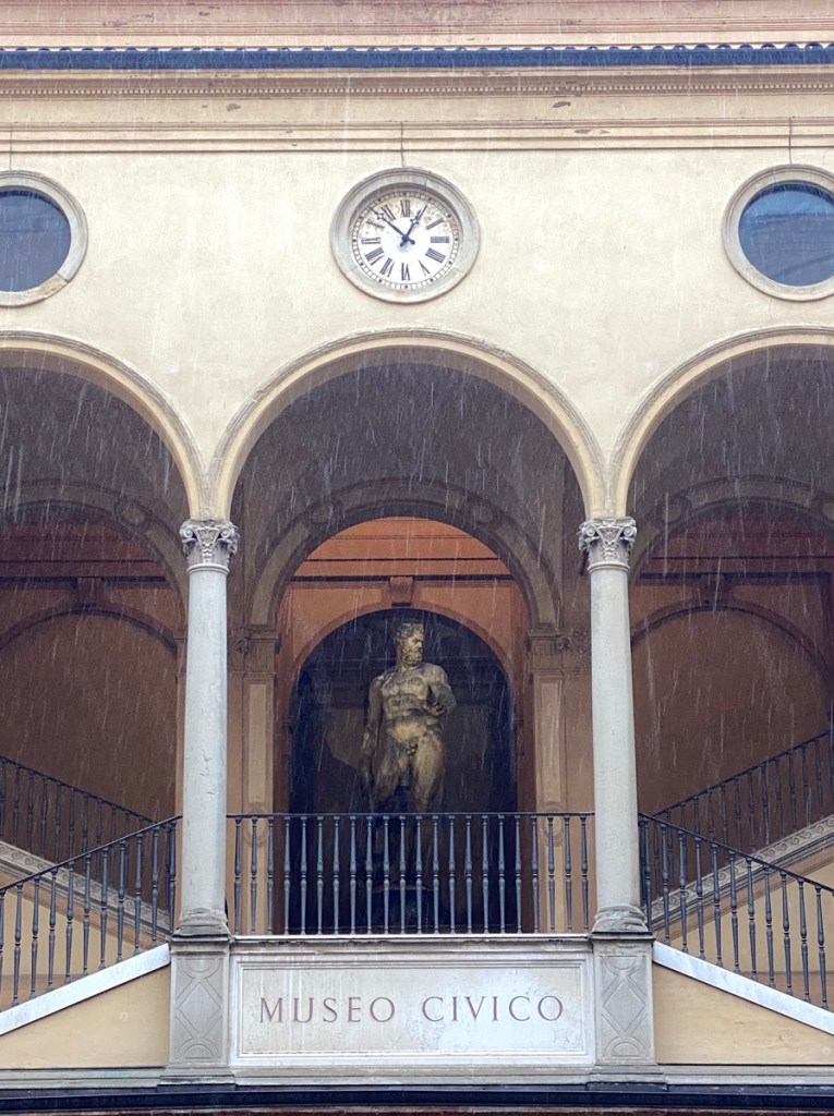 Mit Kapuze und unter Arkaden ging es dann weiter ins Museo Civico Archeologico, wo den Interessierten lange Gänge und große Hallen voller Schätze erwarten, von der Villanova-Kultur der frühen Etrusker über römische und griechische Hinterlassenschaften bis zu einer großartigen ägyptischen Sammlung. Leider stellt sich bei mir nach einiger Zeit die „Museumskrankheit“ ein: Das Licht, die Stille und das langsame Vorwärtsschlurfen von einem Exponat zum anderen erzeugen eine derartige Müdigkeit, gepaart mit Kreuzweh, dass man sich am liebsten nur mehr irgendwo niedersetzen oder ganz schnell ausschreiten möchte. Ob so oder anders – alles, was das archäologische Museum zu bieten hat, kann man sich unmöglich bei einem einzigen Besuch anschauen. Und das ist schon wieder ein Grund, mindestens noch einmal nach Bologna zu reisen.
