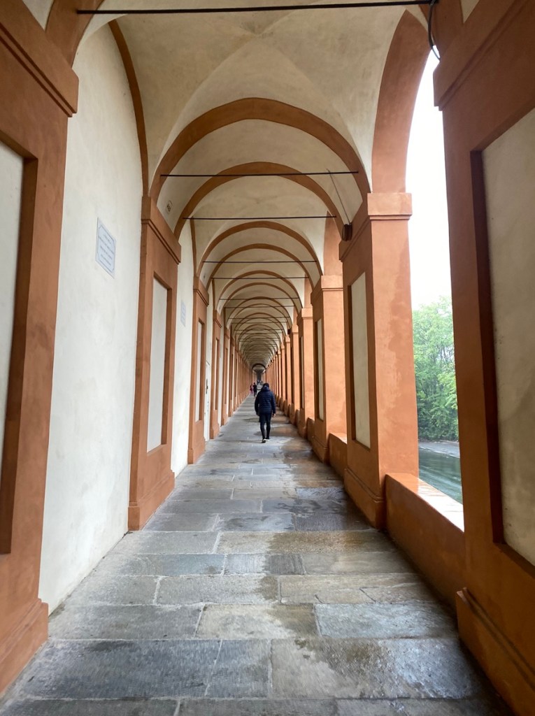 Am Donnerstag beschließen wir, wegen der leichten bis mittelschweren Regenfälle noch einmal durch den Portico zur Kirche San Luca hinaufzuspazieren, diesmal aber vom ersten bis zum letzten Bogen. Das empfiehlt sich bei Regen und unter der Woche durchaus, vor allem, weil da viel weniger Leute unterwegs sind … Und es trägt auch zur notwendigen Ertüchtigung bei. Beim Abstieg biegen wir dort ab, wo wir letztes Mal eingestiegen sind, beim über die Straße führenden Bogen Arco de Meloncello. Durch weitere Arkaden und an einem Fußballstadion vorbei halten wir uns bergab, bis wir am Friedhof Certosa – eigentlich Cimitero Monumentale della Certosa di Bologna – einlangen. Als wir dort ankommen, hört es grad so nach und nach zu regnen auf und wir betreten ehrfürchtig das Gelände, das vom Tourismusbüro als „Monumentalfriedhof“ bezeichnet wird.