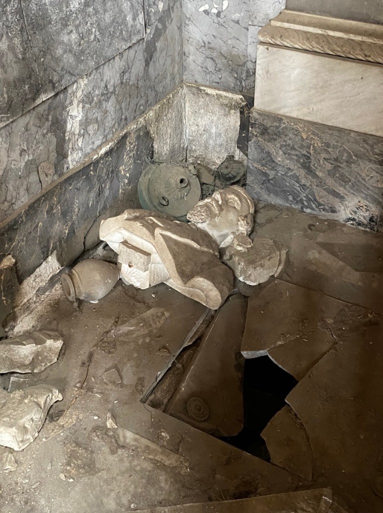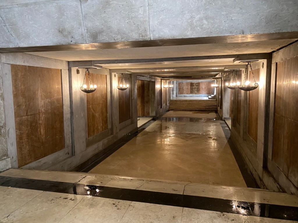Immer wieder stößt man auf Zeichen von Renovierungen, auf abgesperrte Bereiche, auf Baustellen (wo natürlich nichts gearbeitet wird … aber vielleicht liegt’s ja an der Uhrzeit. Oder am Wetter) und eingestürzte Gräber. In manchen Hallen bemühen wir uns besonders vorsichtig, über rissige Bodenbereiche und Steinplatten hinwegzusteigen, weil wir sonst mitsamt dem Mauerwerk in einer der unteren Hallen landen könnten. Und dort findet einen bei dem Wetter sicher nicht so bald wer.