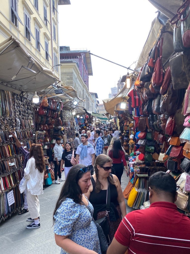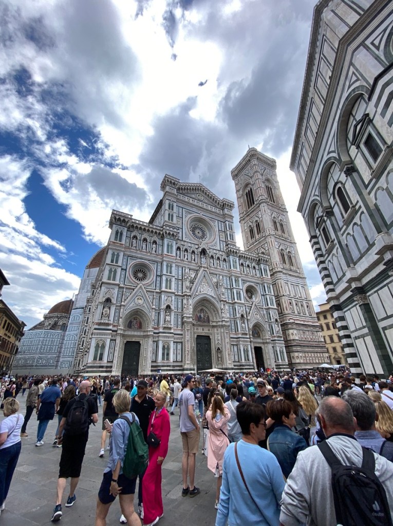 … bis wir uns in die Straßen und Gassen vorwagen und feststellen müssen, dass Florenz mittlerweile noch mehr von Touristen überlaufen ist als in den Jahren zuvor – und da war schon viel los. Durch die Märkte für Ledertaschen und ähnliche Standardware (in jedem Standl verkaufen sie dasselbe) wälzen sich die Massen und suchen vergebens nach Originalität, aber die haben die Massen ja auch in ihrem Leben nicht, also macht es keinen Unterschied für sie. In den Dom und das Baptisterium braucht man gar nicht hineinzukommen versuchen, so lang sind die Menschenschlangen; wahrscheinlich ist mittlerweile hier wie fast allüberall einer der verhassten „Time-Slots“ vonnöten. Da wir aber keine Time-Sluts sind und sowieso was anderes vorhaben, drängen wir uns weiter durch die Menge.
