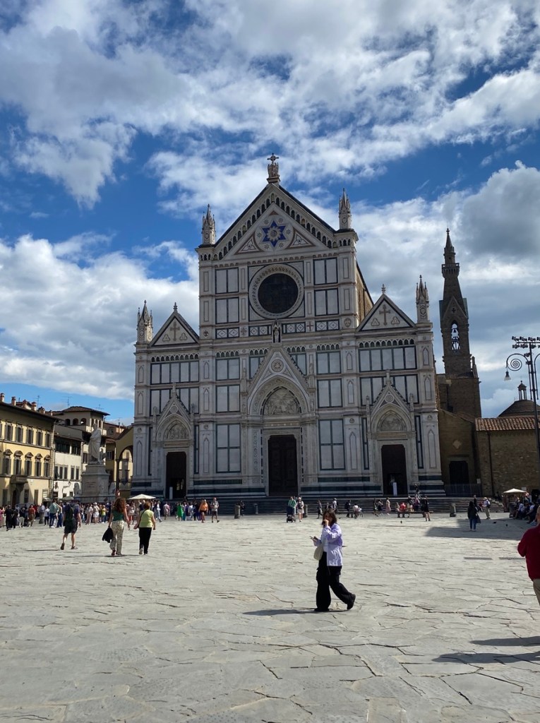 Dann nähern wir uns unserem eigentlichen Tagesziel, der wunderschönen Basilica di Santa Croce – meiner Ansicht nach der schönsten Kirche von Florenz, wo der Kartenkauf wundersamerweise binnen drei Minuten erledigt ist und wir uns im Inneren des Gebäudes frei bewegen können, ohne dauernd von Pauschalreisenden insultiert zu werden. Santa Croce ist, wie meine Mutter immer sagt, „wie Musik“, und das spürt man schon, wenn man dieses herrliche Gotteshaus betritt.