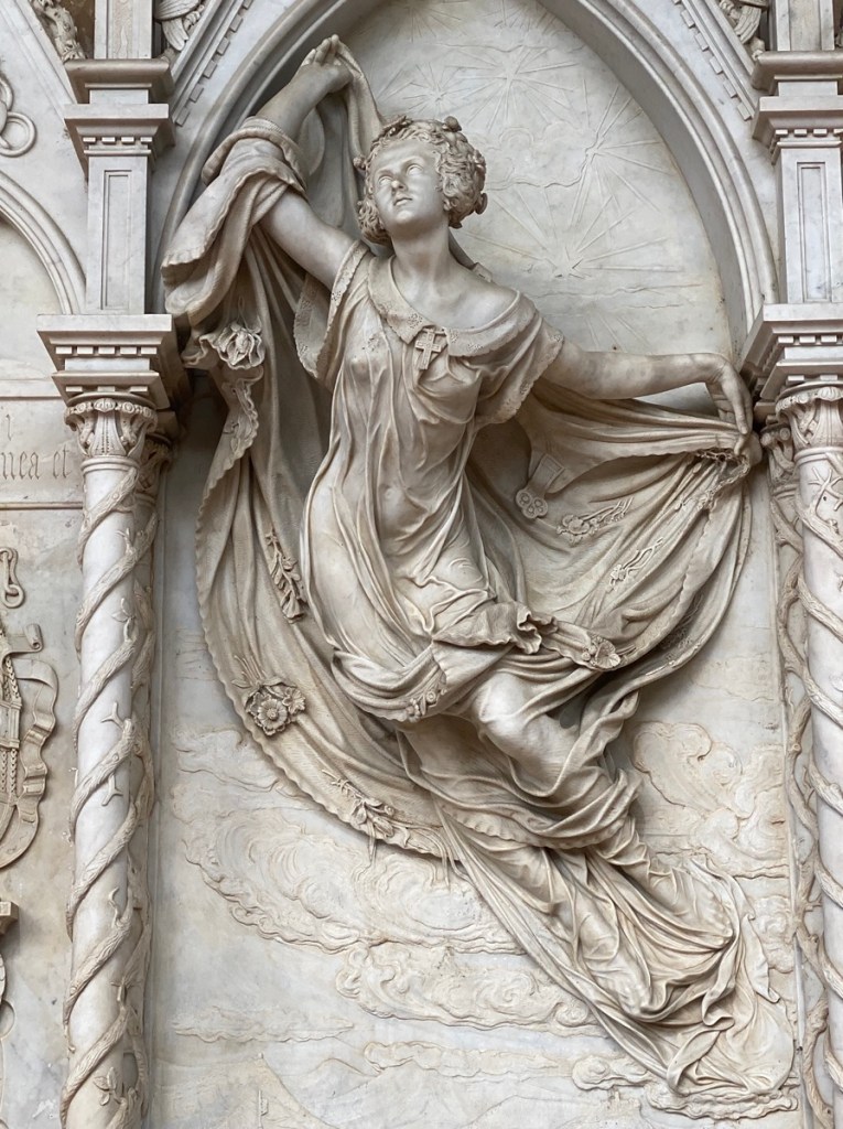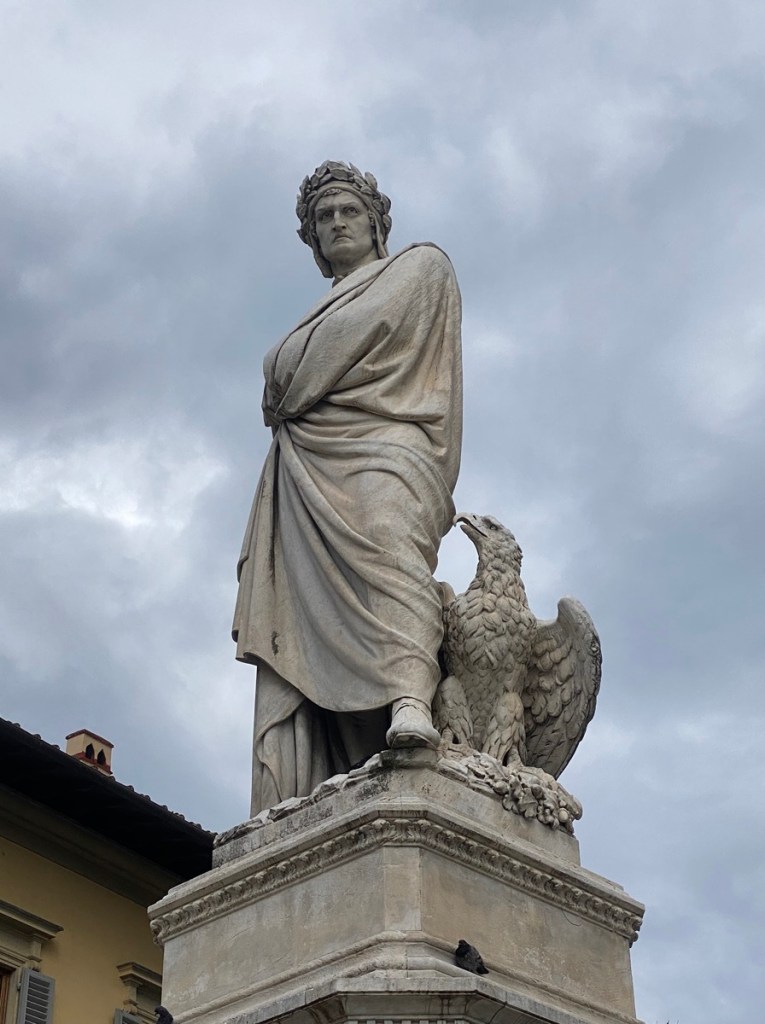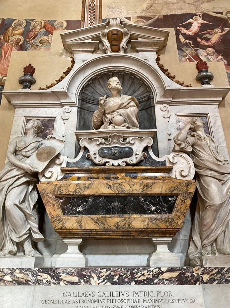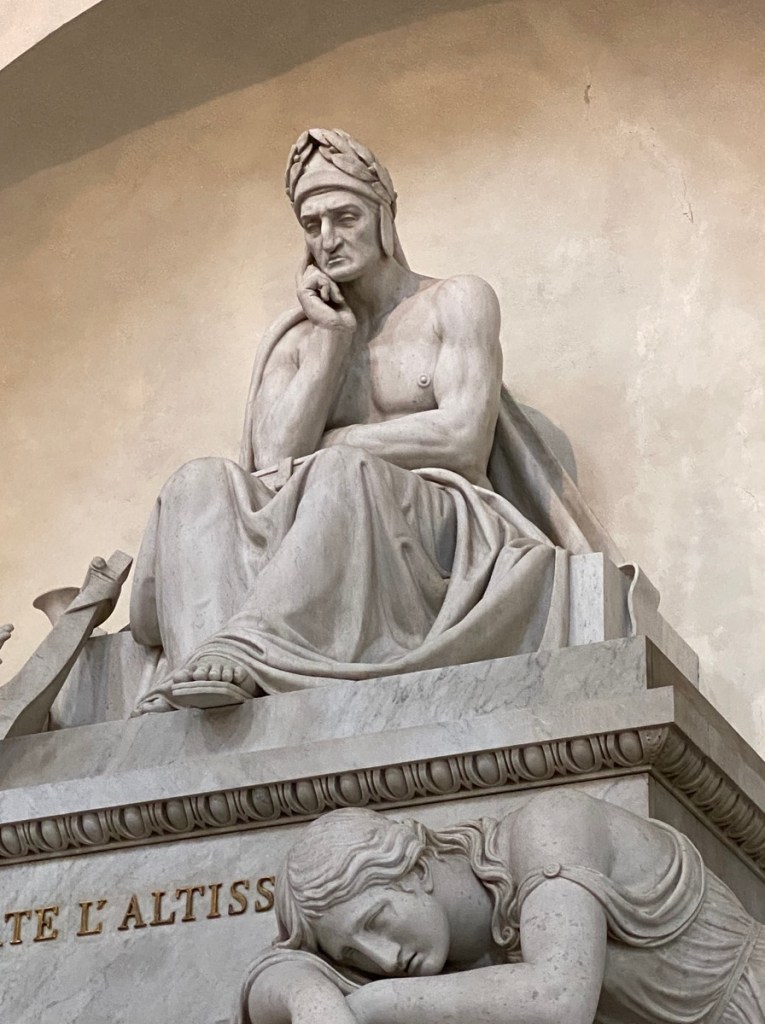 Wir betrachten die Grabmäler, für die diese Kirche berühmt ist, unter anderem das von Galileo Galilei und Dante Alighieri (siehe unten). Dante wirkt schlecht gelaunt, aber so fühlt man sich halt eventuell, wenn man tot ist.