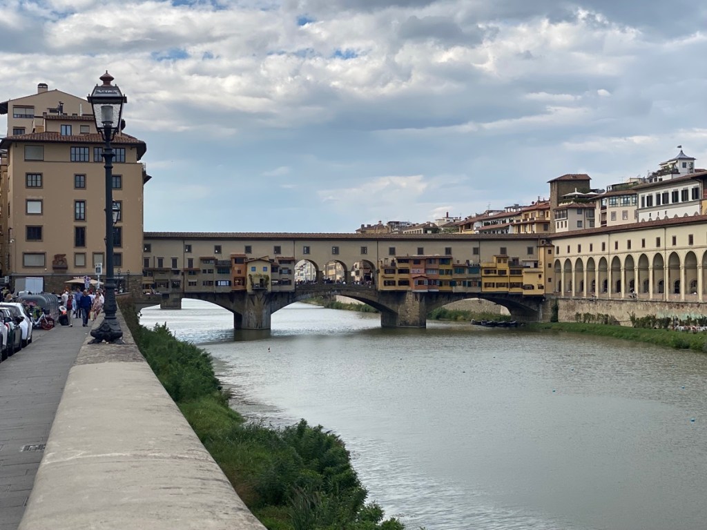 Nachdem wir uns eine Weile in Souvenirgeschäften herumgetrieben haben, geht es weiter zur Ponte Vecchio, weil: Die muss sein, wenn man in Florenz ist. Auch wenn zwischen den vielen Juwelieren auf der Brücke ein Gedränge herrscht, dass man froh ist, wenn man auf der anderen Seite ankommt. Oberhalb der Brücke und rechts davon sieht man den Vasarikorridor, durch den die besseren Herrschaften einst diskret vom Palazzo Pitti zum Palazzo Vecchio spazieren konnten. Heute ist er im Rahmen von Führungen auch für Touristen zugänglich, aber das heben wir uns lieber auch fürs nächste Mal auf.
