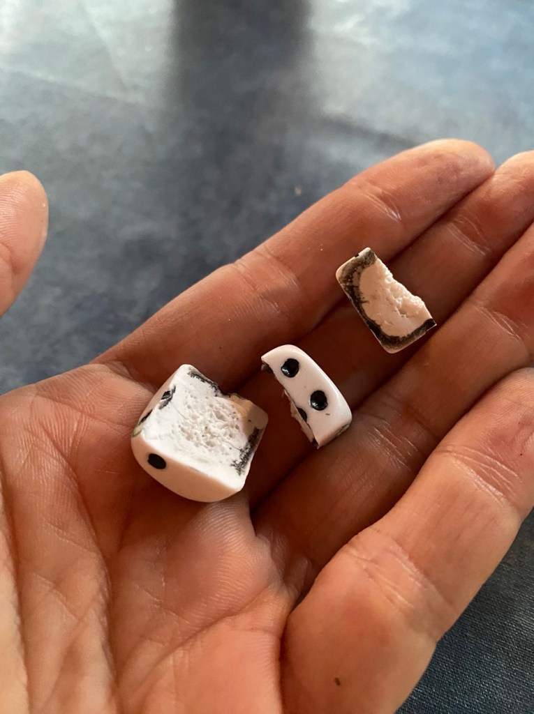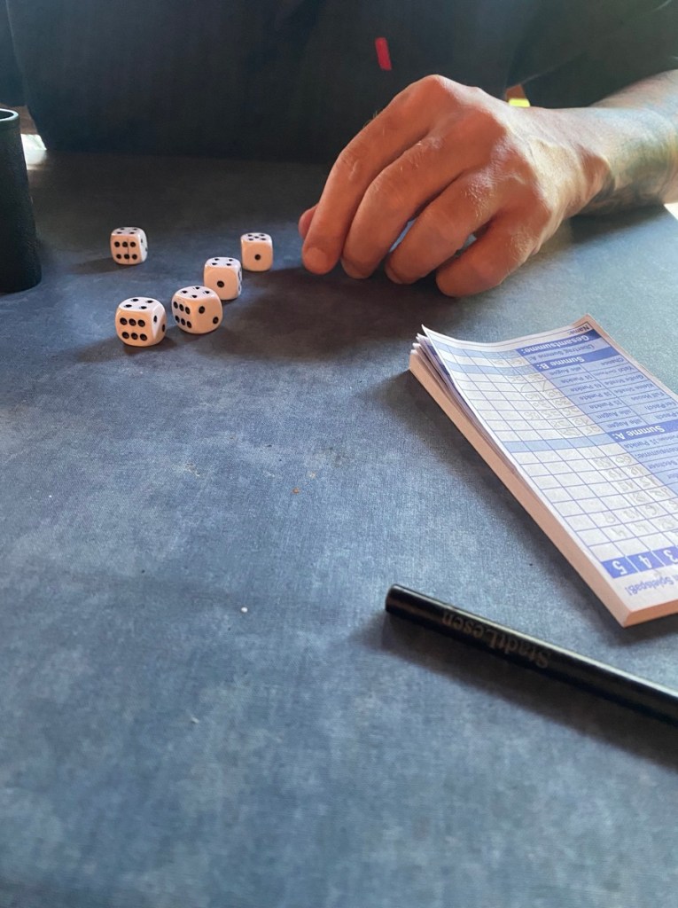 Nach dem für die Hausgäste servierten Abendessen (der Gasthausbesitzer ist unwahrscheinlich schlecht gelaunt, wahrscheinlich, weil er nicht einmal am Ruhetag seine Ruhe hat) spielen Katharina und ich noch zwei Runden Würfelpoker. Dabei überlege ich mir, dass ich plötzlich doch ein Abweichler bin, weil das alles mit meinen üblichen Lebensgewohnheiten so gar nichts zu tun hat. Ist es etwa das, was andere Leute unter „Urlaub“ oder „Freizeit“ verstehen? Jedenfalls habe ich hier weder Computer noch iPad dabei, versenke mich nicht in drei, vier Bücher oder Hefte gleichzeitig (sondern führe bewusst langweilige Kriminalgeschichten mit, um nicht schon wieder dauernd zu lesen), sondern sitze plötzlich da und spiele Würfelpoker (?!¶”$][?!). Das kommt plötzlich auch einem der Würfel so spanisch vor, dass es ihn einfach zerreißt. Ein Qualitätsprodukt – zehn Würfel für 99 Cent. Da haben wir ja Gott sei Dank immer noch genug zum Weiterspielen.