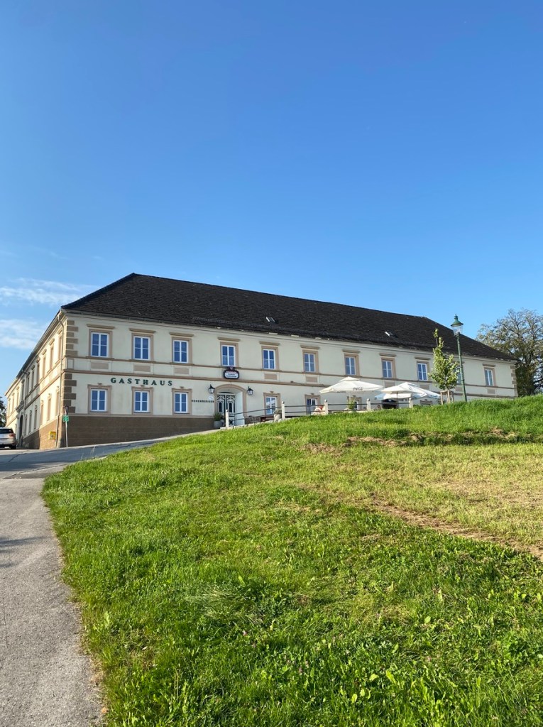 Der Tag fängt mit einem guten Frühstück an. Danach gehen wir schon recht früh los, verabschieden uns mit einem Blick zurück vom Kirchenwirten und marschieren die Straße entlang nach Wallsee hinunter.