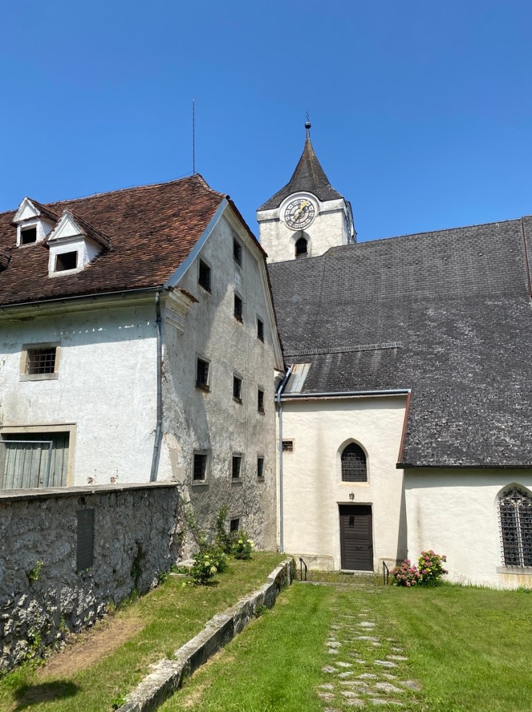 … über Feldwege und an den allgegenwärtigen Marterln vorbei, bis wir in den Ort Erla kommen und dortselbst die Kirche umrunden, auf der Suche nach dem Haupteingang zu diesem Gotteshaus.