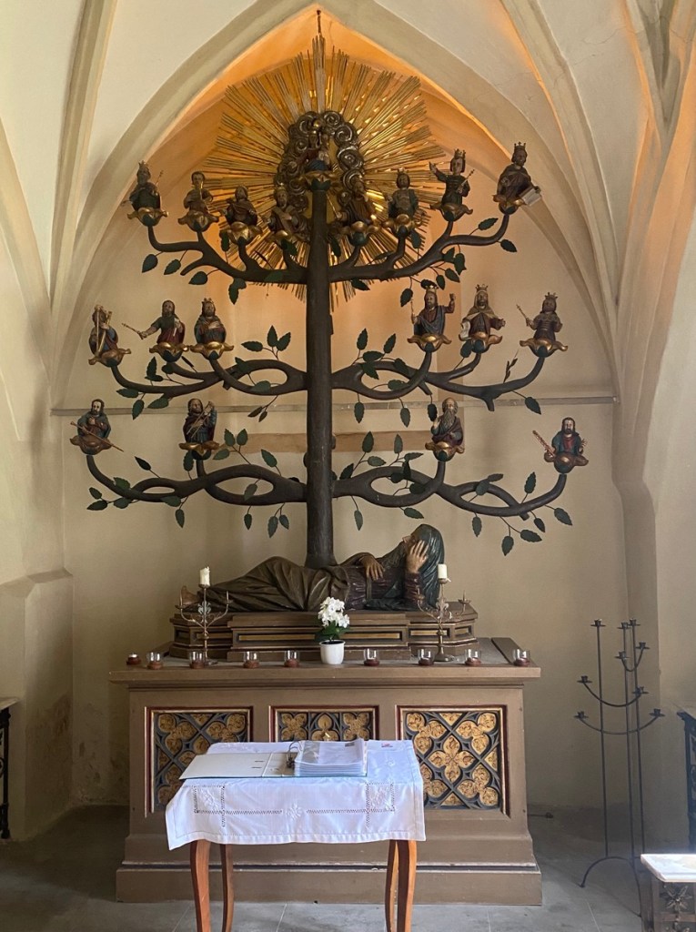 Aber egal. Wir finden den Eingang zur wunderschönen Pfarrkirche St. Peter und Paul, der ehemaligen Stiftskirche eines Benediktinerinnenklosters, und bestaunen sie von außen und von innen. Besonders der Stammbaum auf dem Photo unten links hat es uns angetan.