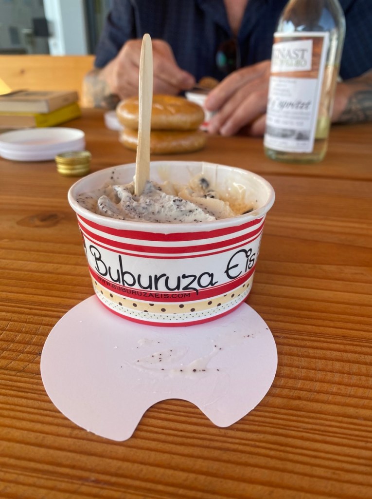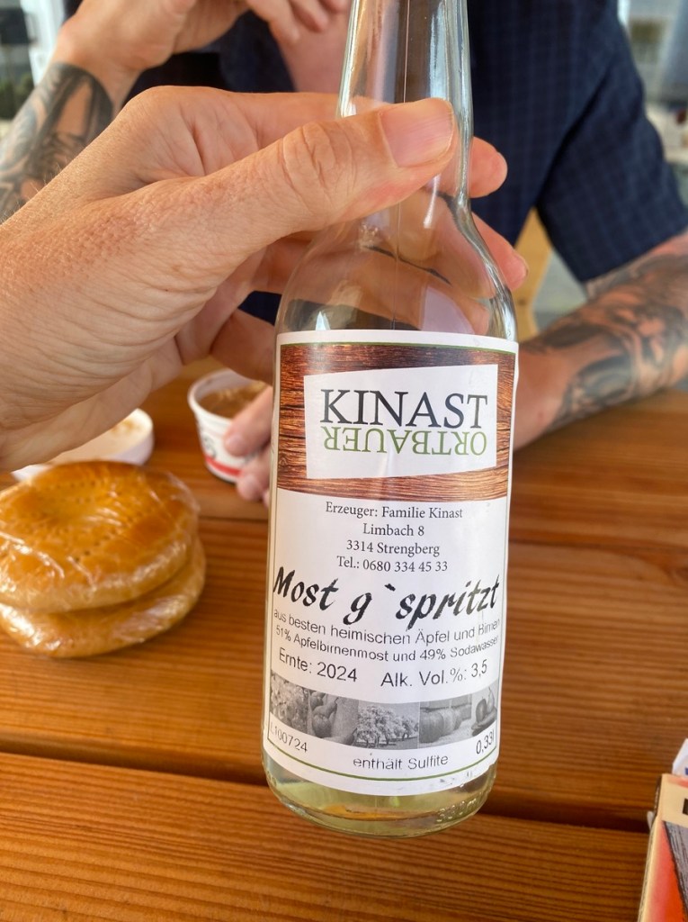 Später am Nachmittag unternehmen wir einen kurzen Spaziergang am Bächlein entlang, um den Dorfladen des Ortes aufzusuchen. Hier haben ein paar unternehmungslustige Herren nicht nur ein (herrlich klimatisiertes) Geschäftslokal mit den üblichen regionalen Spezialitäten eingerichtet, sondern auch Kaffee- und Getränkeautomaten aufgestellt, eine E-Tankstelle und einen Automaten für innovative Tabakprodukte (sagt man so, wenn sich keiner mehr echte Tschick rauchen traut?) installiert und vor dem Haus sonnenbeschirmte Tische aufgestellt. Wir essen also ein Eis, trinken g’spritzten Most und können somit die wahrscheinlich einzige Attraktion von St. Pantaleon abhaken.