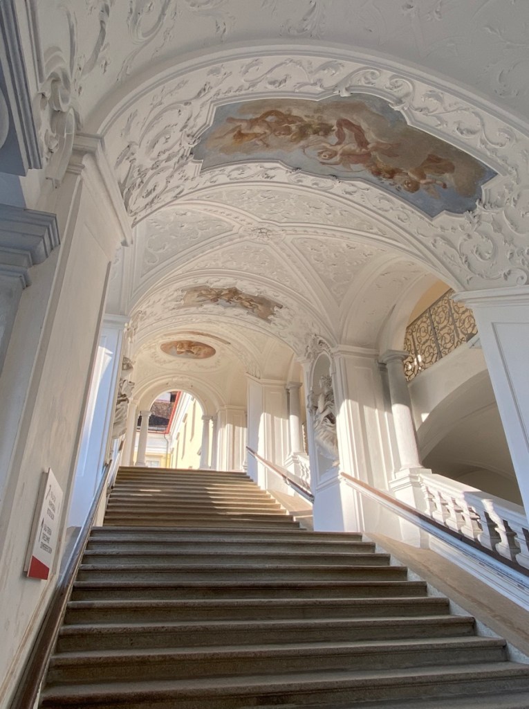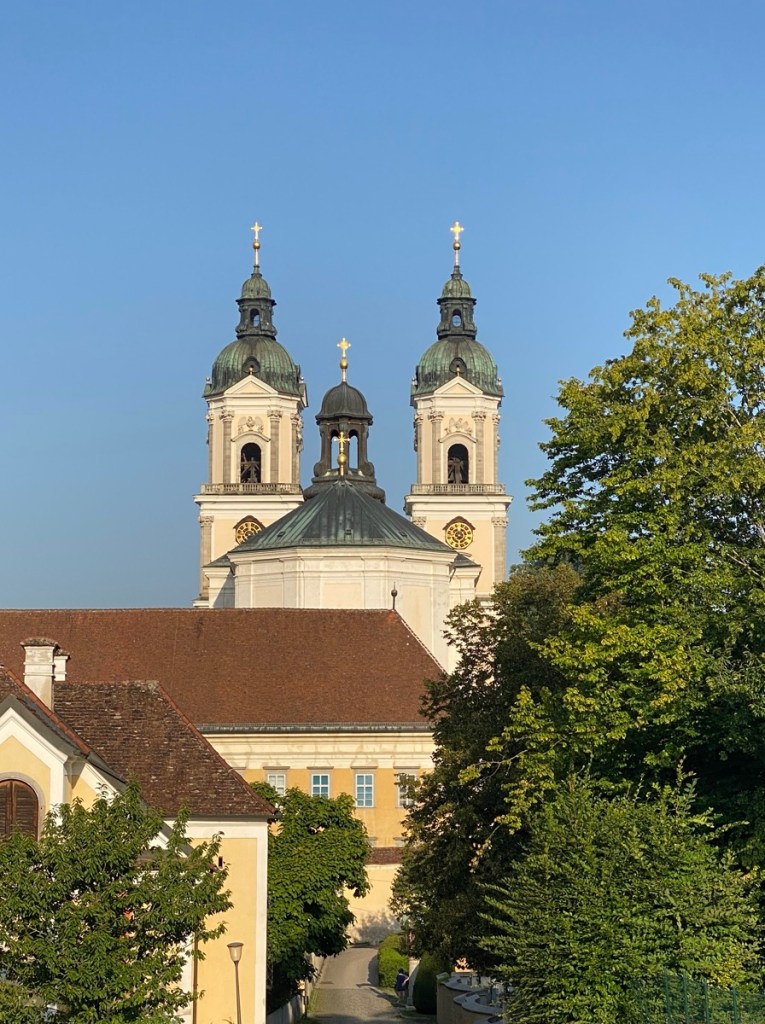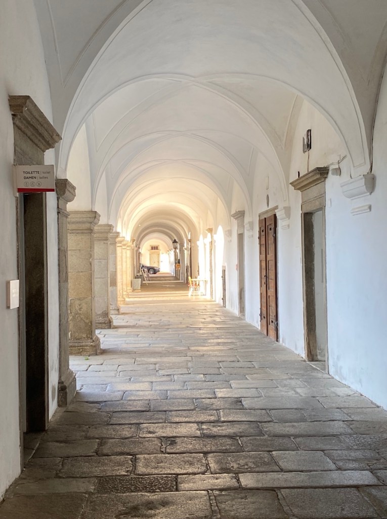 So scheint es mir zumindest an diesem fünften August-Pilgertag, als wir nach einem äußerst frühen Frühstück (unsichtbare Angestellte haben im Stiftskeller ein Buffet aufgebaut, sich aber dann wahrscheinlich noch einmal zum Schlafen hingelegt, weil es nicht einmal sieben Uhr ist, als wir auftauchen) durchs menschenleere Stift St. Florian gehen, uns noch einmal an den prächtigen Gängen und Treppen erfreuen, um dann das Stiftsgelände durch den Hintereingang zu verlassen. Eine scharfe Kurve, ein Stück den Hügel hinauf, und schon sehen wir das Stift von oben …