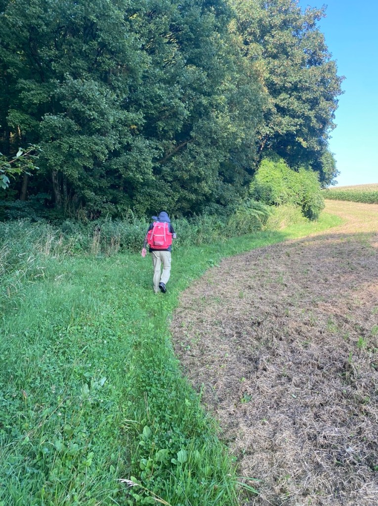 An religiösen Gedenkstätten und Marterln – denen begegnet man auf dem Jakobsweg wirklich oft, und das ist auch gut so – vorbei erreichen wir einen Waldweg, den wir bergab gehen. Und dann heißt es wieder Straßen, Ortschaften etc. pp., das kennen wir ja schon. Vor einer Kreuzung haben wir den Eindruck, dass es jetzt eigentlich rechts bergauf gehen müsste, das sagen auch unsere klugen Bücher.