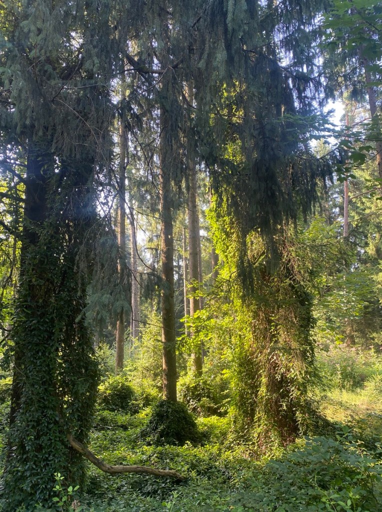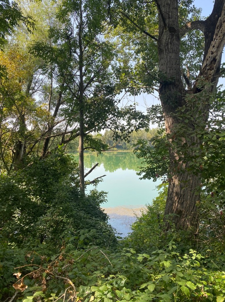 Katharina sieht auf dem Handy parallel verlaufende Wege, die tatsächlich durch ein Stück Auwald und an Teichen vorbeiführen. Das bringt ein wenig Erleichterung, und irgendwann ist auch der Horror-Radweg zu Ende bzw. wandelt sich zu einer etwas breiteren Horrorstraße …