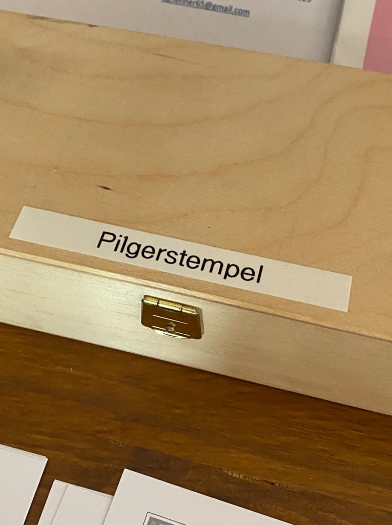 In der Pfarrkirche von Ansfelden erwartet uns eine schöne Holzkiste mit der Aufschrift „Pilgerstempel“, die große Erwartungen weckt. Aber wie so oft in derartigen Fällen werden die Erwartungen enttäuscht, weil sich in der Schachtel kein Stempel befindet, sondern nur ausgeschnittene Papierstückln mit dem Stempelabdruck darauf, den man dann in sein Pilgerbuch einkleben darf. Wer bastelt mit?