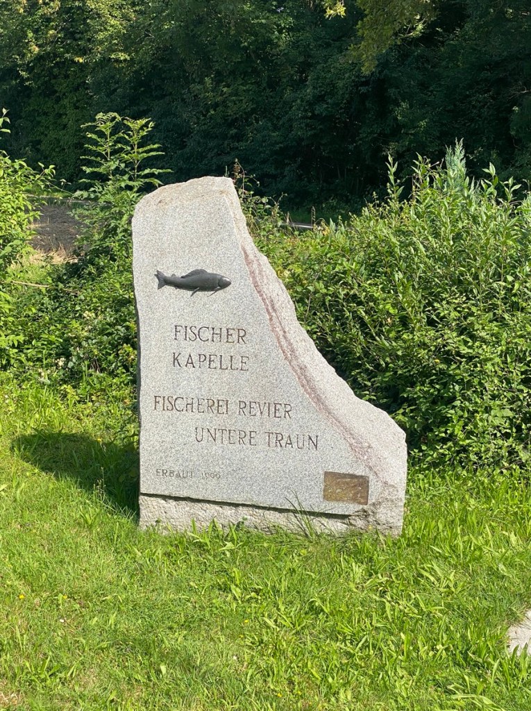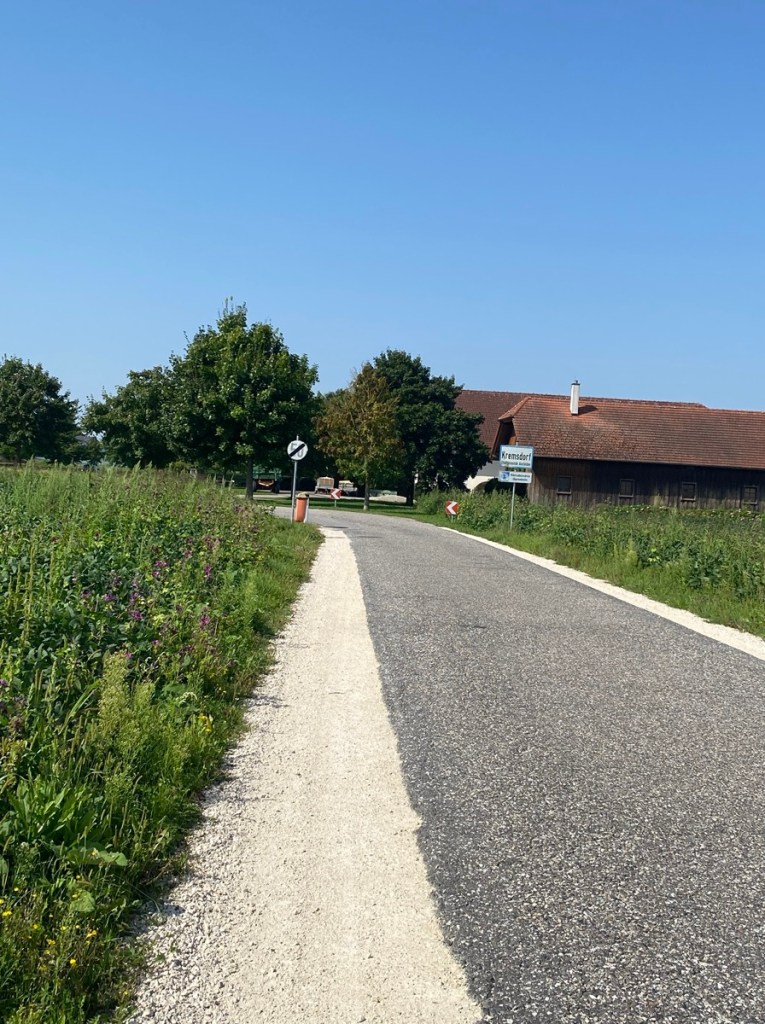 Ansfelden liegt schnell wieder hinter uns. Wir gehen dann durch die paar Häuser von Kremsdorf, kommen wieder auf eine größere Straße und sehen bald das Schild „Gasthof Hotel Stockinger“ vor uns. Grund genug zum Einkehren und Hollersodatrinken, gleich zwei große Gläser für jeden, weil der Flüssigkeitsverlust ohnehin schlimm genug ist. Der freundliche Wirt kommt kurz her und plaudert mit uns, auch über den Pilgerweg. Jetzt geht’s noch eine Zeitlang auf Asphalt weiter, sagt er, aber wenn wir dann zur Traun kommen, führt der Weg durch den Auwald.
