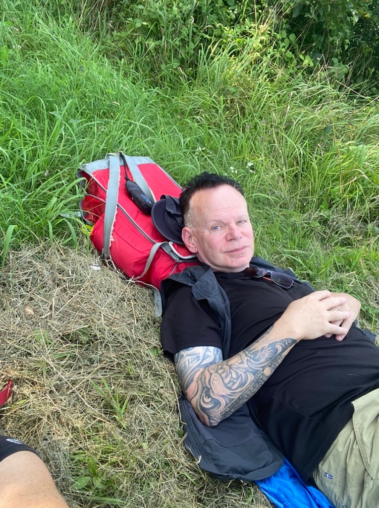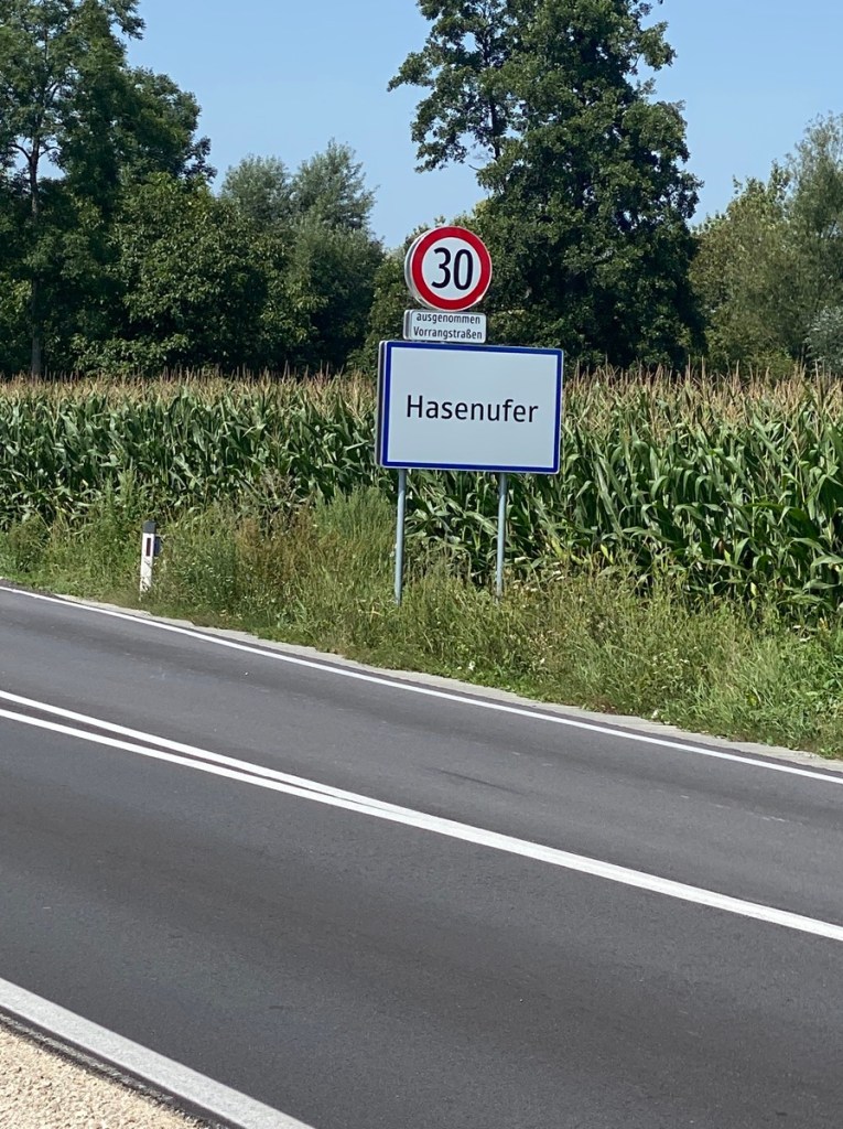 Da ich den physischen und psychischen Zusammenbruch nahen fühle, geleitet mich die wohlmeinende Gattin zu einer Wiese am Wegesrand, wo ich durch eine mittellange Pause den nahenden Exitus wieder ein paar Schritte zurückdrängen kann. Auf der Todesstrecke rasen einstweilen immer mehr Radfahrer hin und her, einer davon – bis auf eine kurze Hose nackt, zutätowiert und mit baumelnden Männerbrüsten (der Mensch soll nicht nackend sein) – taucht sogar zweimal auf. Aber vielleicht habe ich den auch nur halluziniert. Ich würde hier und jetzt den Pilgermarsch aufgeben, aber wer soll mich hier aufsammeln? Rettungsradfahrer vielleicht?