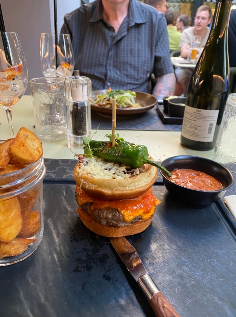 Wir sind fassungslos und müssen uns das Lachen verbeißen (so wie der junge Gast im Anzug, der hinter uns auf was wartet). Am liebsten würde ich antworten: „Ja, des hamma im Rucksack“, aber damit würde ich die Sylphe (haben Sie schon bei Google nachgeschaut?) nur noch mehr verwirren, also lasse ich mich nur zu einem „Nein, wir sind zu Fuß gekommen“ hinreißen. Der Blick ändert sich nicht.