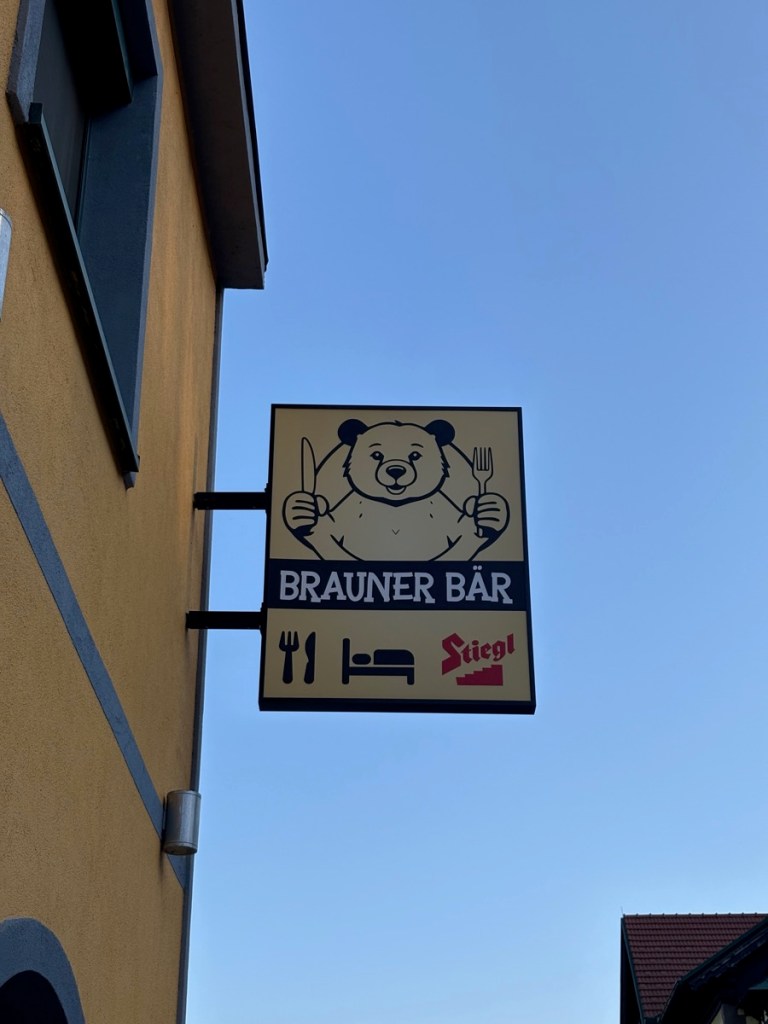 Am Beginn unserer traditionsreichen Greifenstein-Tour – der ersten, die wir in die Urfassung unseres unverzichtbaren Buches Wandern im Wienerwald aufgenommen haben und beide (Helmuth A. W. – der heute leider nicht dabei sein kann – und ich) seid Jugendjahren immer wieder gegangen sind – pfeift uns eh noch ein kalter Wind um die Ohren. Wir kommen am Gasthaus Brauner Bär vorbei, gleich auf der Hauptstraße 10 in Greifenstein, und registrieren zu unserer Freude, dass dieses Lokal nach einer seeehr langen Pause wieder geöffnet hat. Für unsere Zwecke ist es zwar nicht unbedingt geeignet, weil es direkt am Beginn der Wanderung liegt und erst um 11 Uhr vormittag aufsperrt (da wollen wir schon längst woanders sein), aber falls sich jemand entscheiden sollte, die Tour in die andere Richtung zu gehen, könnte man sich hier zum Abschluss eine Mahlzeit oder Erfrischung gönnen.