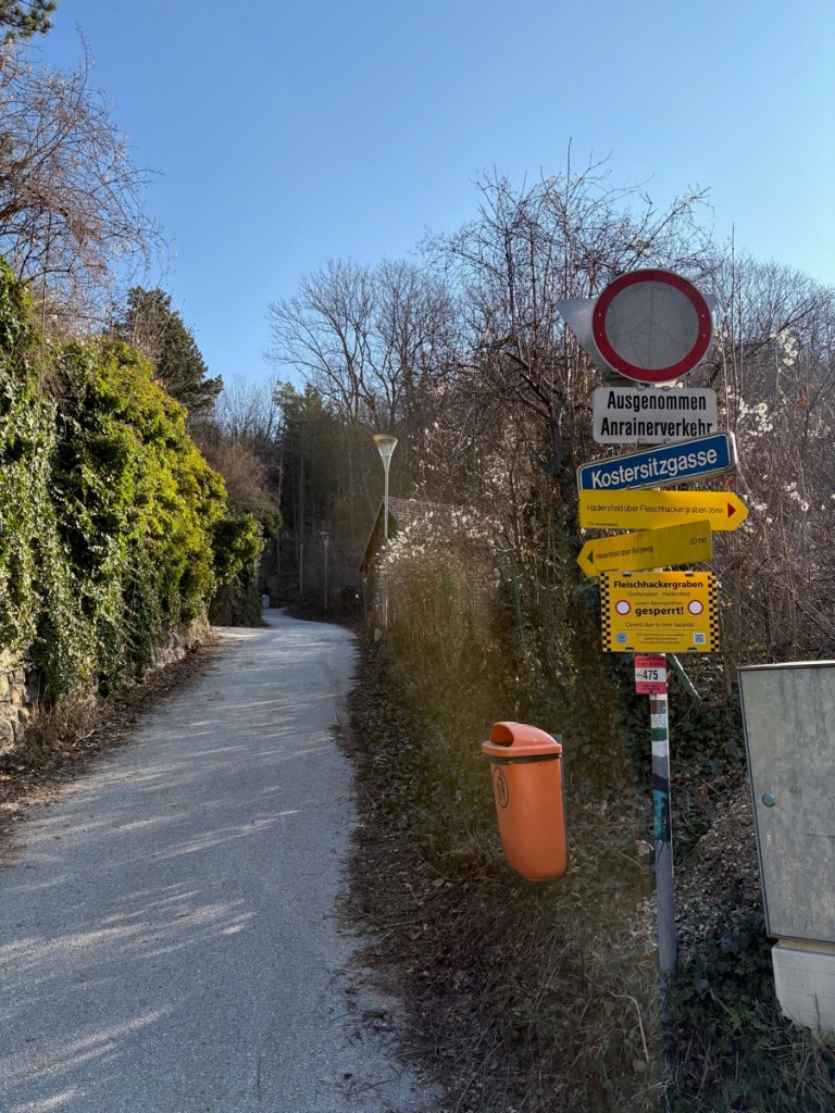 Wir gehen weiter, durch die Hadersfelder Straße (wo wir wie immer beim Greifenstein-Burgmodell haltmachen, das diesmal unser Beitragsbild ist) zur Kostersitzgasse und beginnen den Anstieg zum Burgweg. Das Schild, mit dem der „Unternehmer“, dem man die Burg Greifenstein leider billigst überlassen hat, seit vielen Jahren das einfache Volk am Schmäh hält, verrät uns nun, dass die Burg nicht mehr bis 2023, sondern „bis auf Weiteres“ für die Öffentlichkeit gesperrt ist. Wer hätte ernsthaft etwas anderes erwartet?