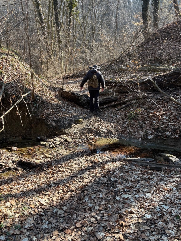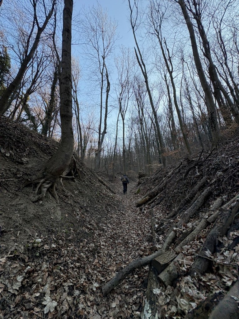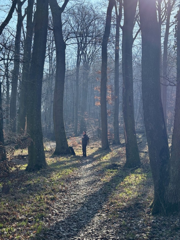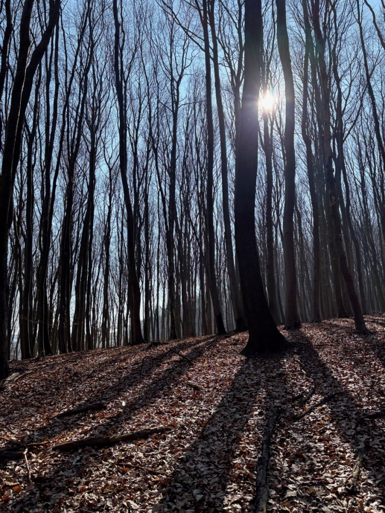 Kurz überlegt einer der mutigen Feldherren, die Wanderung hier vorzeitig abzubrechen, aber dann siegt doch die Disziplin, und wir machen uns an den Aufstieg nach Hintersdorf. Da die Bäume wie gesagt noch blattlos sind, scheint uns auf dem gesamten Weg heute (immerhin 20 km) die Sonne in die Augen. Aber darüber darf man sich – wie das Leben gezeigt hat – nicht zu sehr aufregen, sonst wird man kaltblütig ausgetauscht. (Das gehört vielleicht nicht hierher, stimmt schon, aber dass es so sein kann, enttäuscht einen doch …)