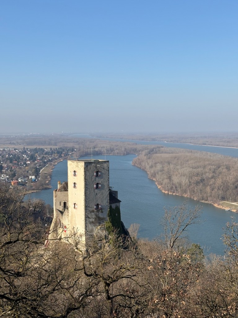 Wir folgen etwas enttäuscht dem gelben Pfeil, der uns Richtung „Hadersfeld Glockenturm 40 Min.“ weist, und schreiten weiterhin munter bergauf. Erste Änderung: Kurz vor den Resten eines Drahtzauns links vom Weg zweigt ein schmaler Pfad links ab, den wir ein paar Meter bis zu einem Aussichtspunkt gehen. Von hier aus haben wir einen schönen Blick auf Greifenstein, die Donau und den Altarm, wie er auch das Cover unseres Buches ziert: