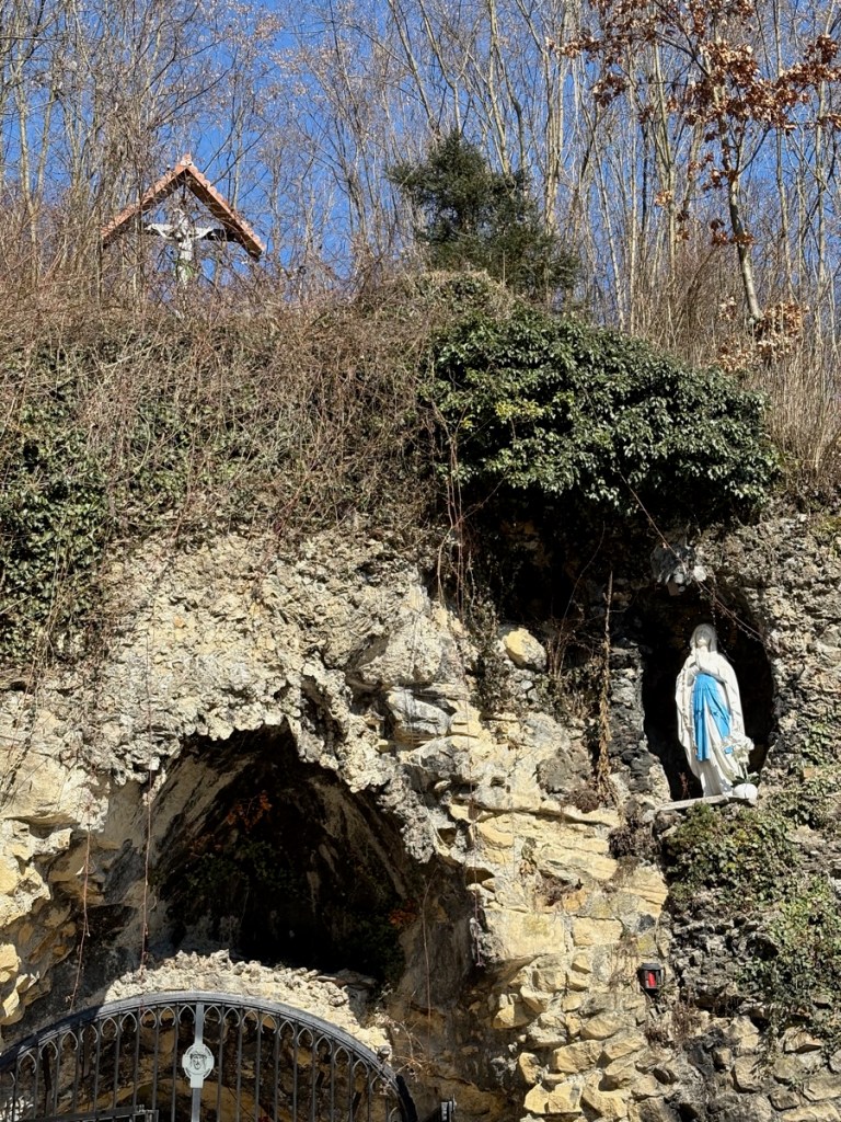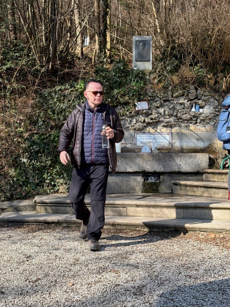Nein, genug von kriegerischen Gedanken! Da treten wir doch viel lieber andächtig den Weg hinunter zur stets höchst erbaulichen Lourdesgrotte an, die wir etwa Eindreiviertelstunden nach Beginn der Wanderung erreichen. Einer von uns beiden nimmt Platz und schaut andächtig in sein Handy, der andere (siehe Photo) füllt seine Trinkflasche mit heiligem Wasser auf, weil man das immer brauchen kann, und investiert locker 20 Euro in Kerzen, die er vor und in der Grotte anzündet, aber auch nach Hause mitnimmt. Hoffentlich mit dem Segen der Muttergottes …